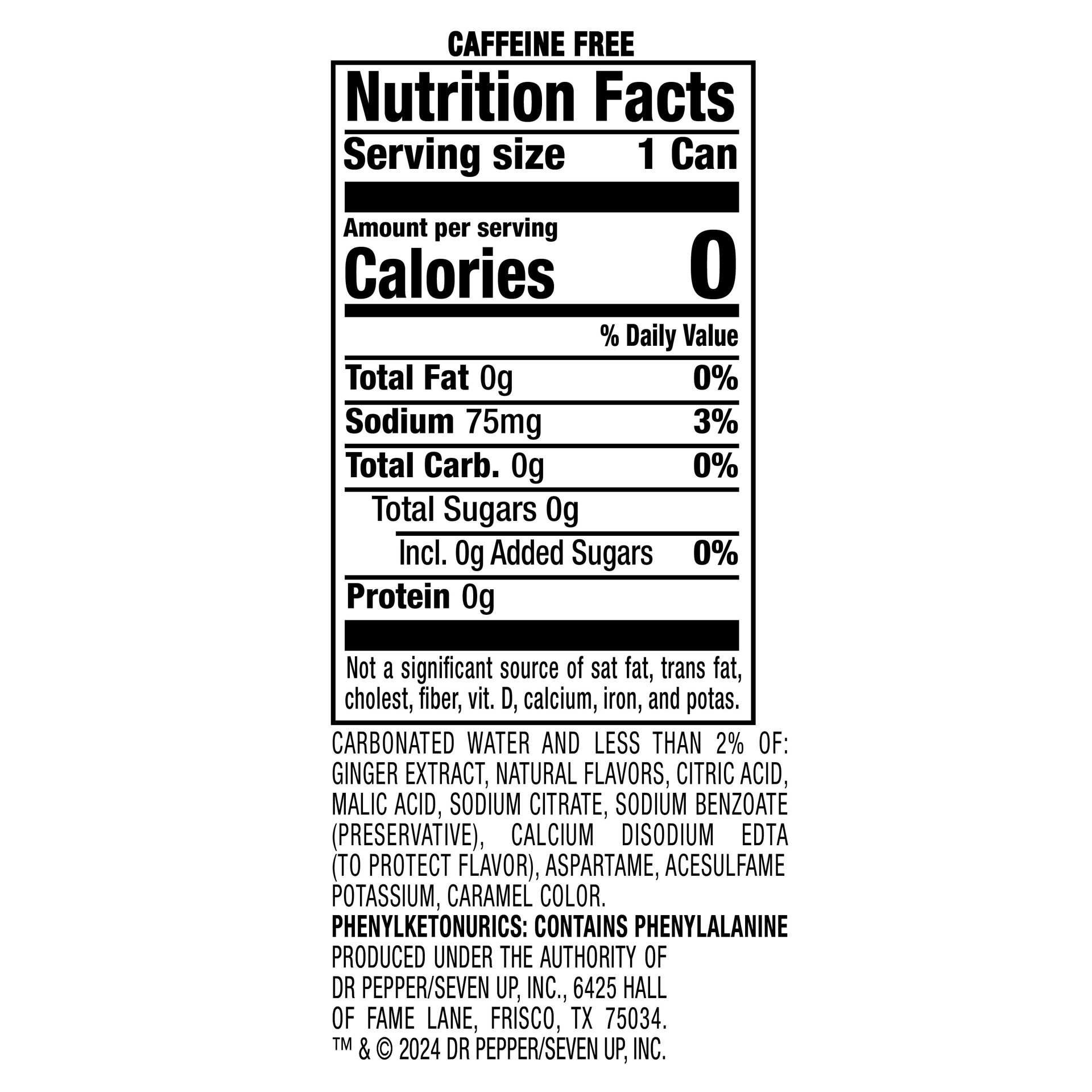 Carbonated Water and Less than 2% of: Ginger Extract, Natural Flavors, Citric Acid, Malic Acid, Sodium Citrate, Sodium Benzoate (Preservative), Calcium Disodium EDTA (to Protect Flavor), Aspartame, Ac…