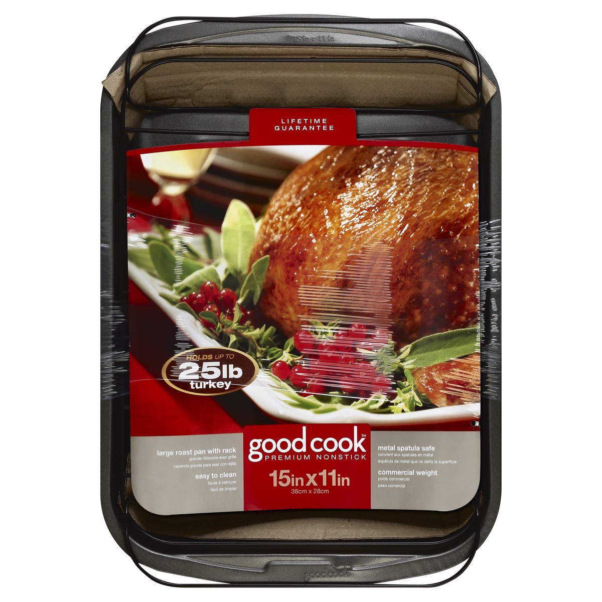 15 in x 11 in (38 cm x 28 cm). Holds up to 25 lb turkey. Lifetime guarantee. Easy to clean. Metal spatula safe. Commercial weight. Thank you for choosing our Good Cook baking pan. Good Cook products a…