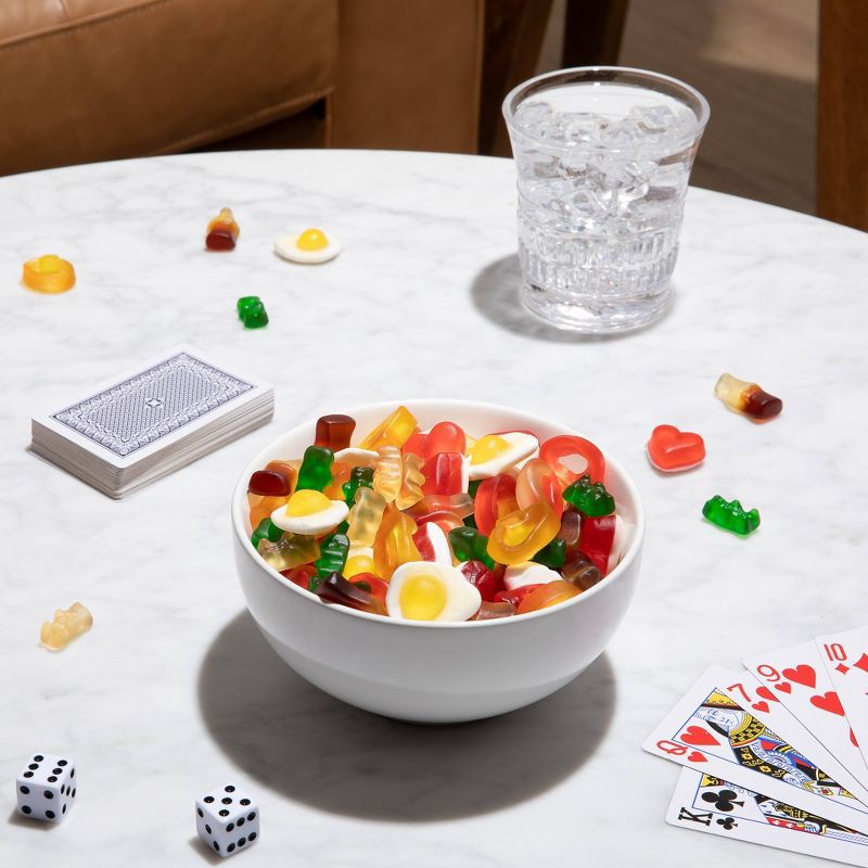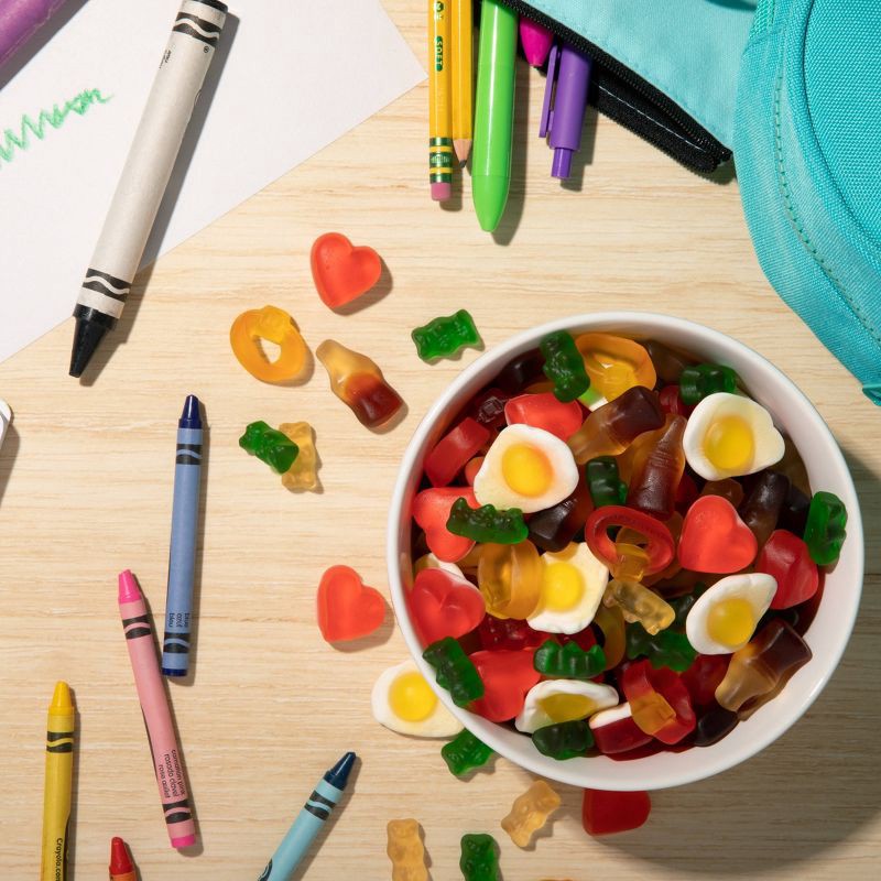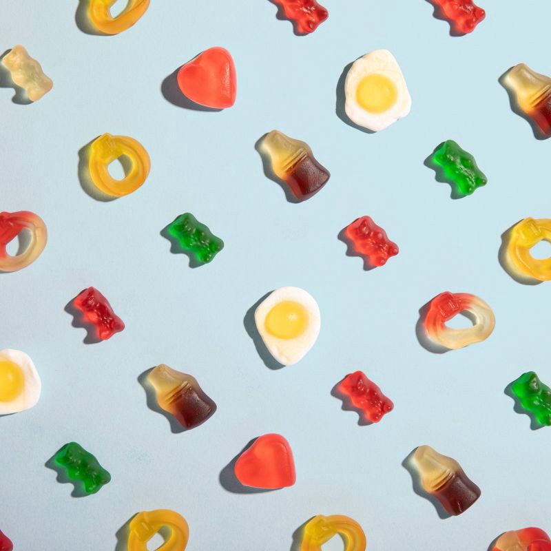 - Enjoy a fun assortment with 5 unique shapes in delicious flavors: original Goldbears, cola bottles, fruity rings, and soft & squishy fried eggs & hearts.
