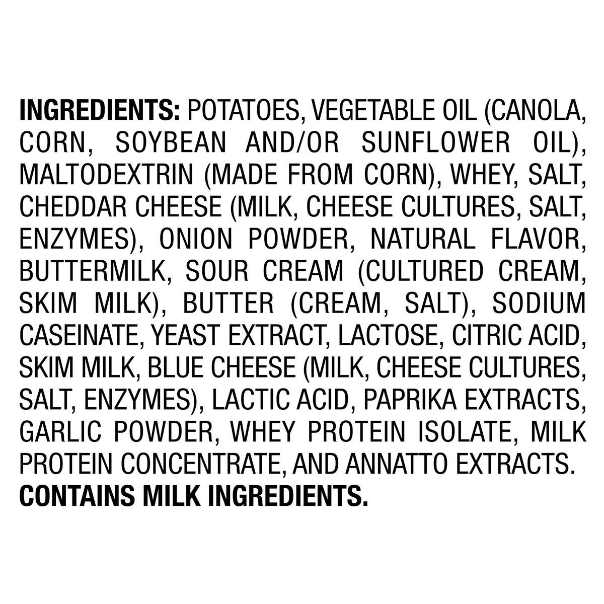 Potatoes, Vegetable Oil (Canola, Corn, Soybean and/or Sunflower Oil), Maltodextrin (Made From Corn), Whey, Salt, Cheddar Cheese (Milk, Cheese Cultures, Salt, Enzymes), Onion Powder, Natural Flavor, Bu…