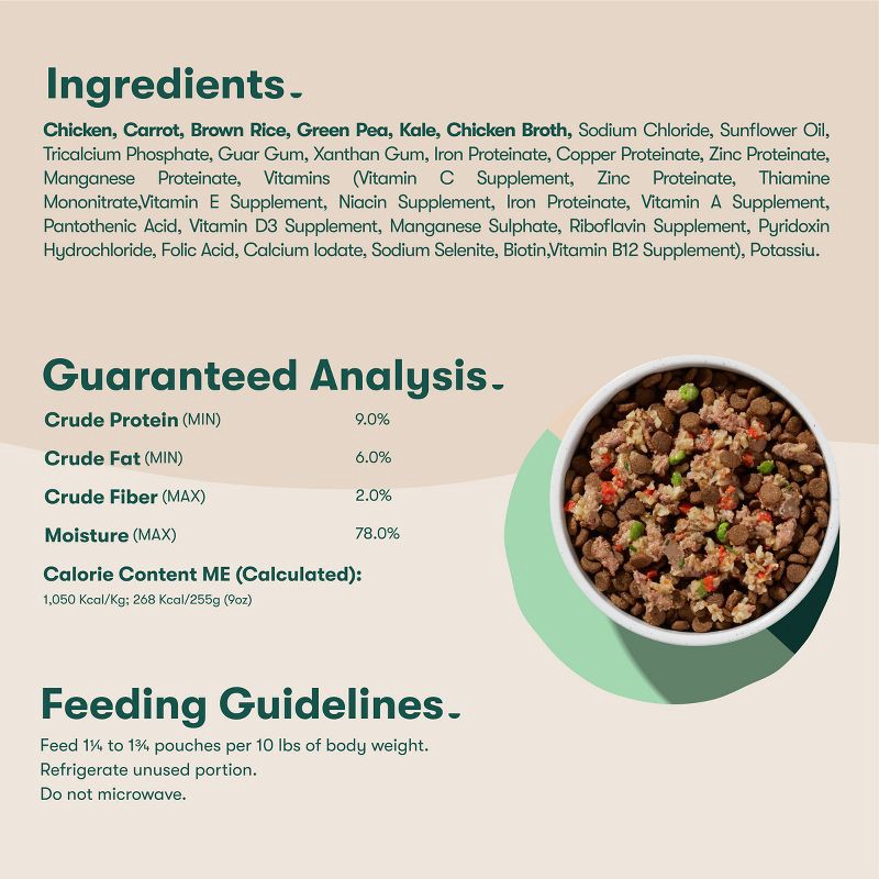 Chicken, Carrot, Brown Rice, Peas, Kale, Chicken Bone Broth, Salt, Sunflower Oil, Tricalcium Phosphate, Iron Proteinate, Copper Proteinate, Zinc Proteinate, Manganese Proteinate, Vitamins (Vitamin C […