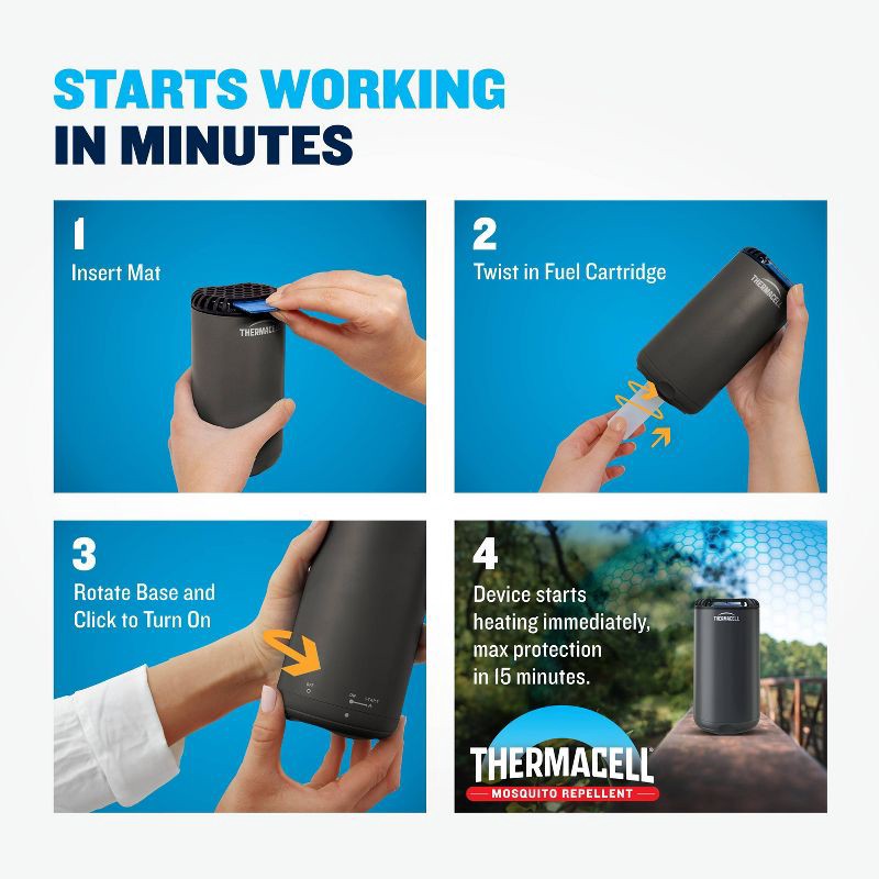 - EASY TO USE: Simply slide your Thermacell repellent mat under the grill, twist the butane fuel cartridge into place, and click 2-3 times to turn on your repeller. Repeller starts heating immediately with max protection in 15 minutes. Just switch the repeller to off when your are done. No need to clean up dead bugs afterwards.