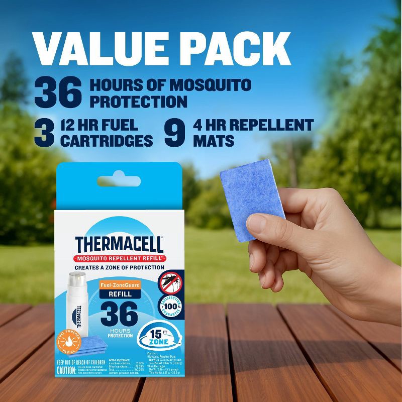 - GENIUNE THERMACELL REFILLS FOR FUEL-POWERED REPELLERS: Only Genuine Thermacell refills are scientifically proven to work with Thermacell repellers to repel mosquitoes from a 15FT zone. Compatible with all Thermacell Fuel-ZoneGuard repellers. Includes 9 4-hour repellent mats and 3 12-hour butane fuel cartridges. Packaging may vary.