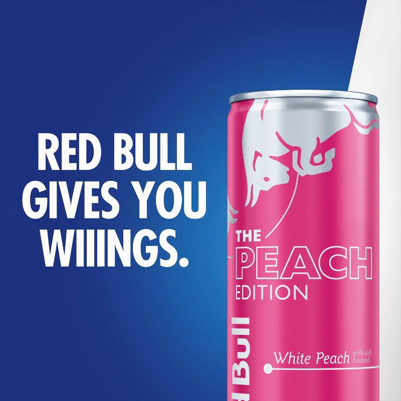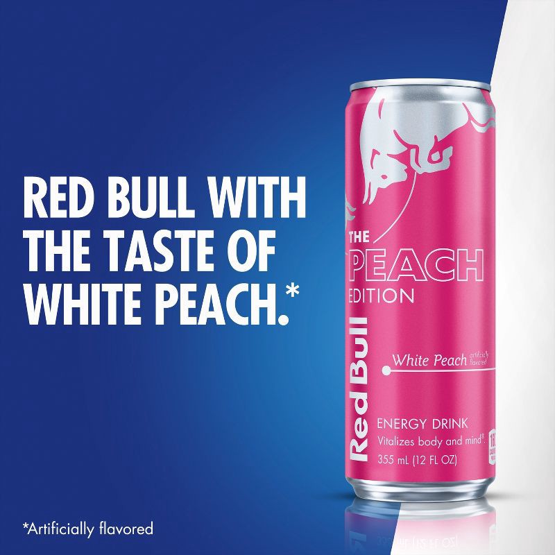 - Enjoy a burst of White Peach, a touch of citrus peel and subtle floral notes in the Red Bull Peach Edition; Red Bull's premium energy blend includes caffeine, the amino acid taurine & four essential B vitamins (B3, B6, B12 and B5), which contribute to normal energy-yielding metabolism.