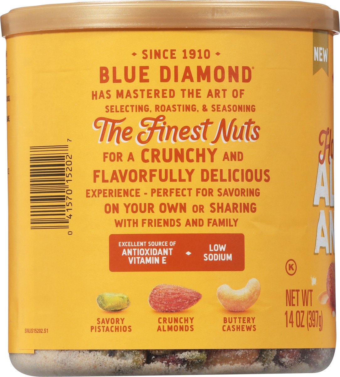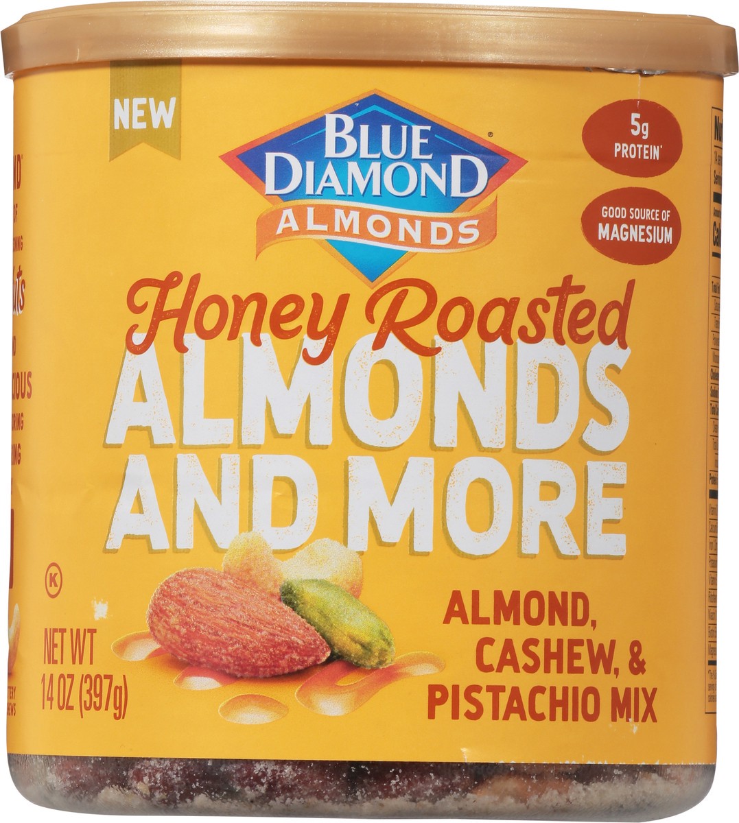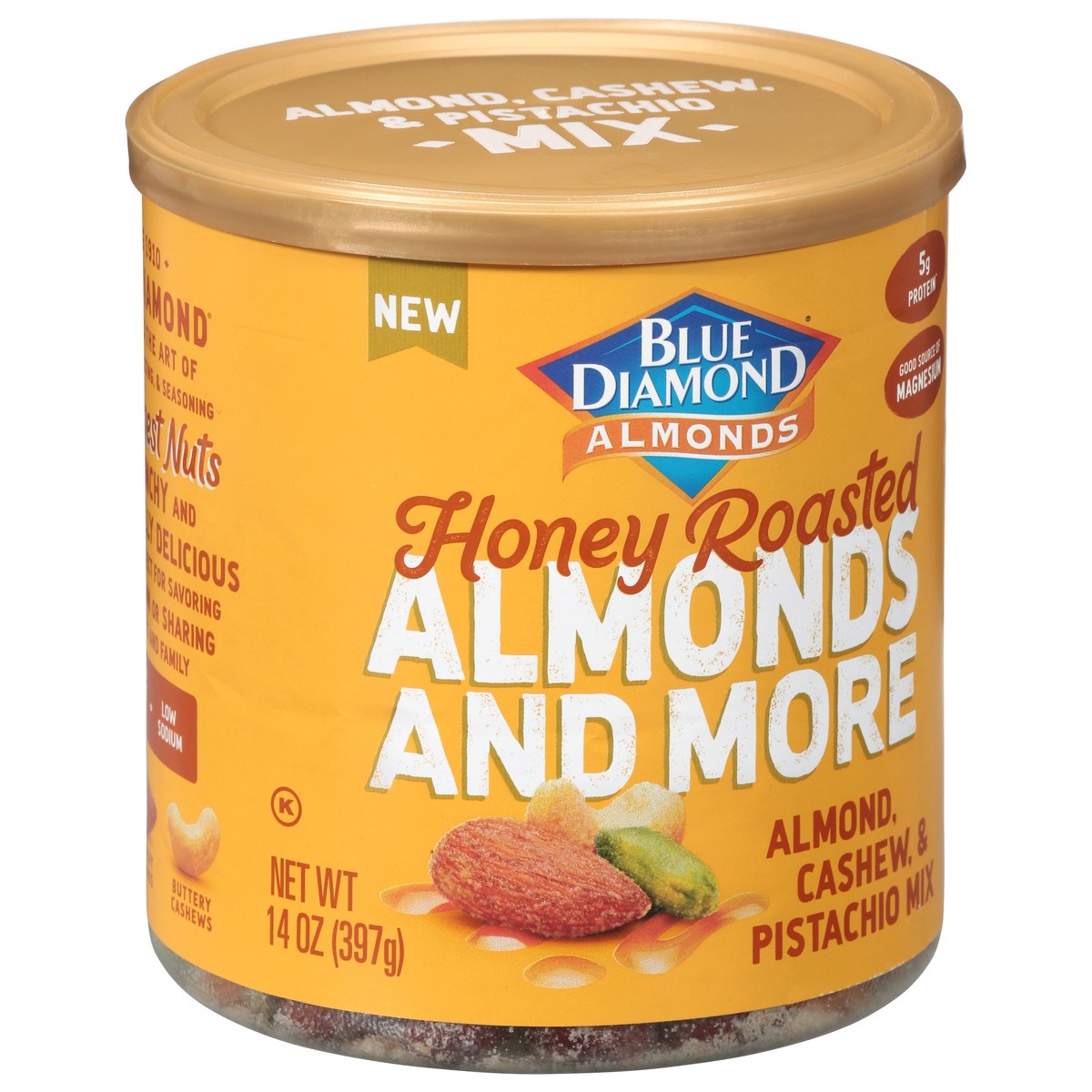 Blue Diamond® Honey Roasted Almonds And More is an assortment of crunchy almonds, buttery cashews, and savory pistachios roasted and seasoned to perfection.Since 1910 Blue Diamond® has mastered the ar…