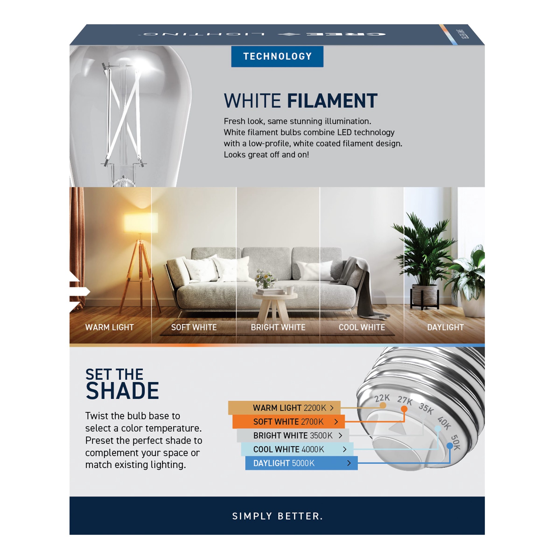 A fresh look with stunning LED light—white filaments glow beautifully on or off. 8.8W ST19 LED Bulb is ideal for replacing 60W incandescent bulbs. 800 Lumens of brightness and 90+ CRI makes colors viv…