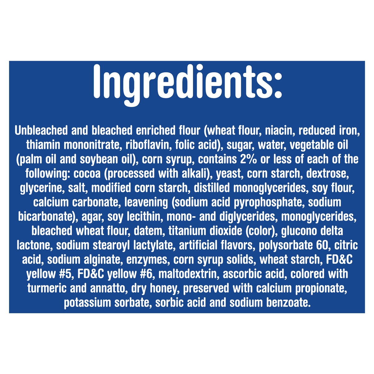 Unbleached and Bleached Enriched Flour (Wheat Flour, Niacin, Reduced Iron, Thiamin Mononitrate, Riboflavin, Folic Acid), Sugar, Water, Vegetable Oil (Palm Oil and Soybean Oil), Corn Syrup, Contains 2%…