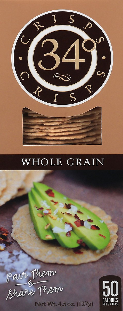 50 calories per 9 crisps. Pair them & share them. Why 34 degrees? Our story of discovery and inspiration is inside. Get Inspired: Whole grains are a smart choice and our Whole Grain Crisps are made fr…