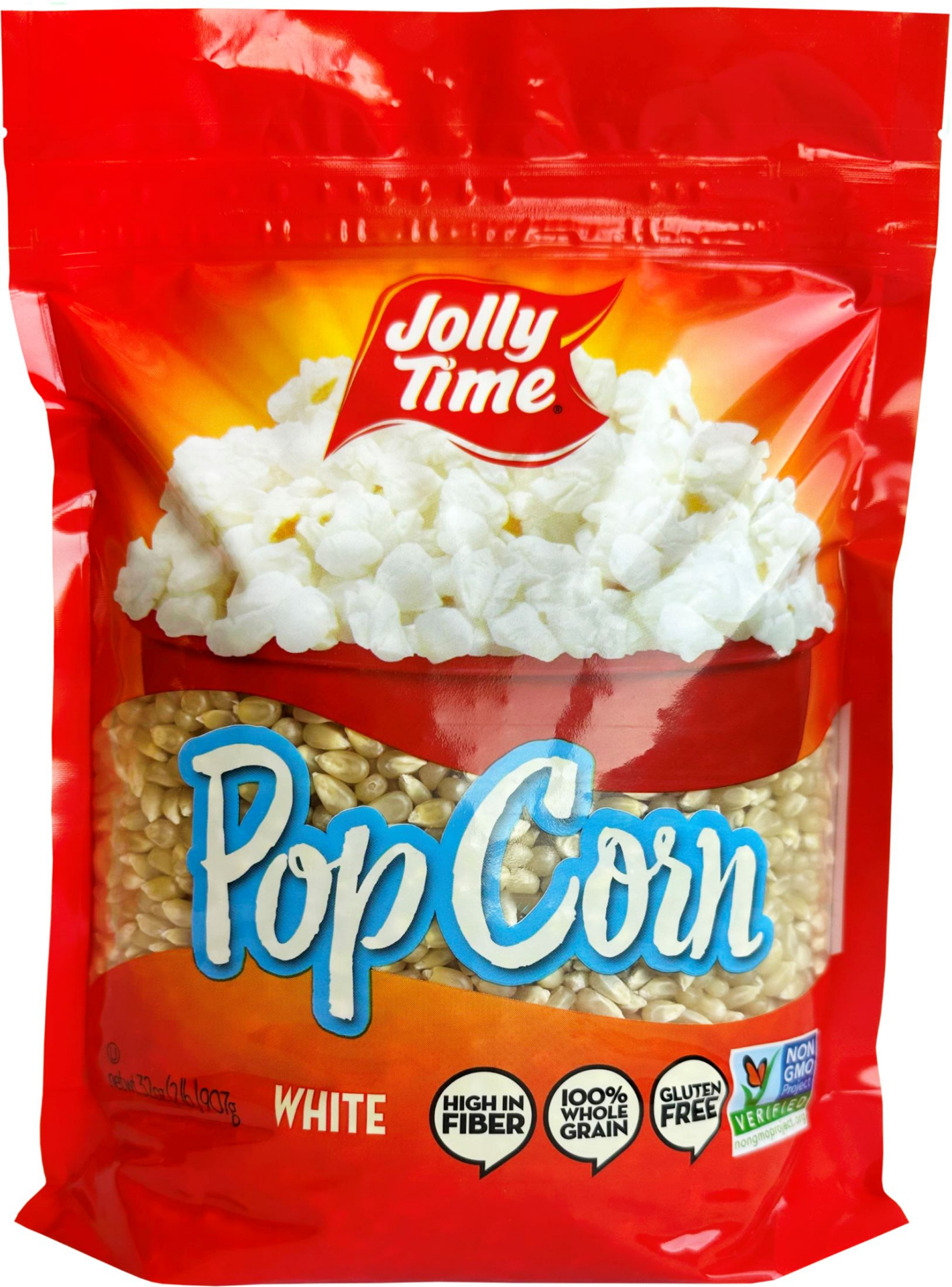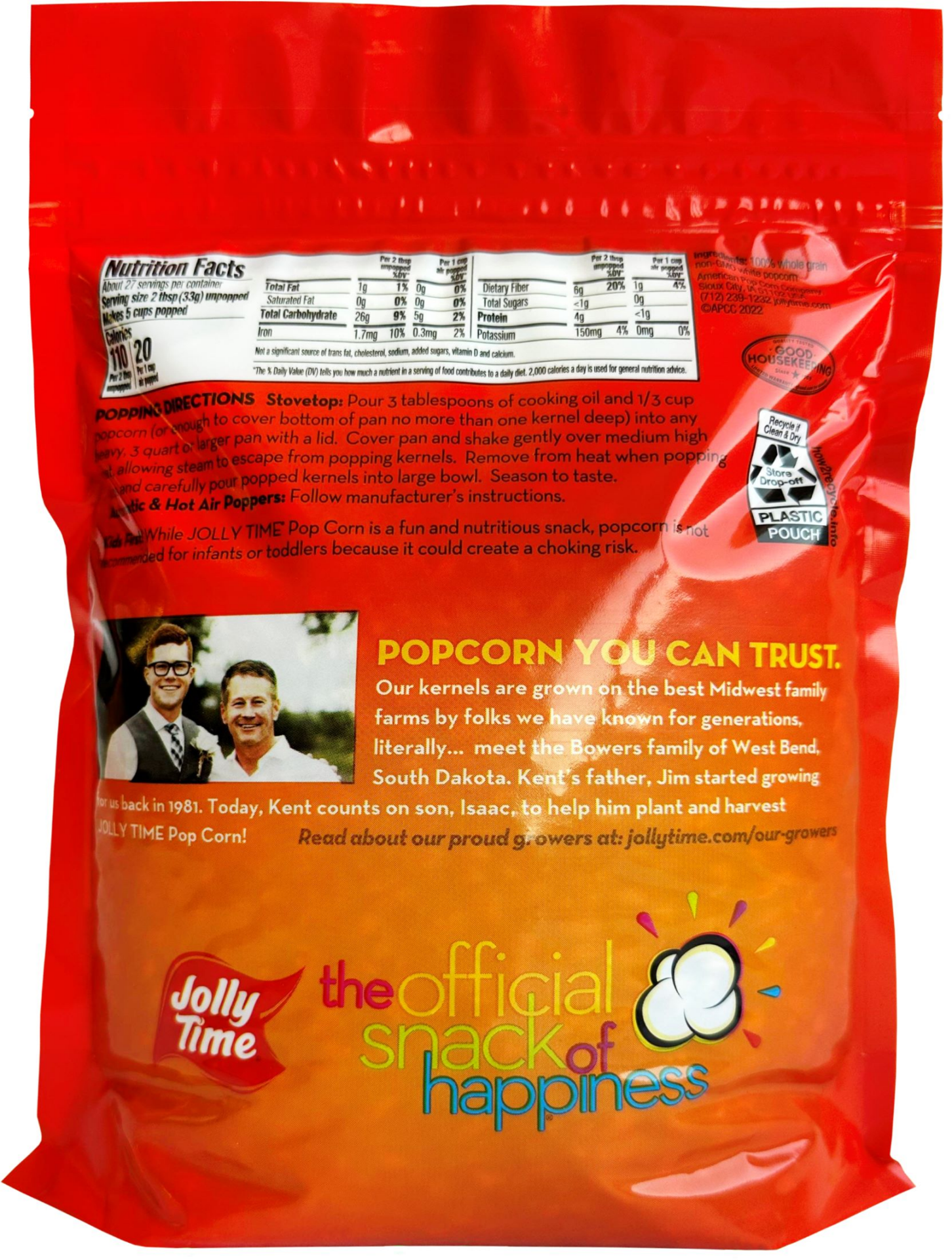 NEW Jolly Time Kernel Stand Up Pouch, 32oz; convenient easy to handle 2lb Poly Bag; 100% recyclable material, high in fiber 100% whole gran, gluten free, non-gmo project verified