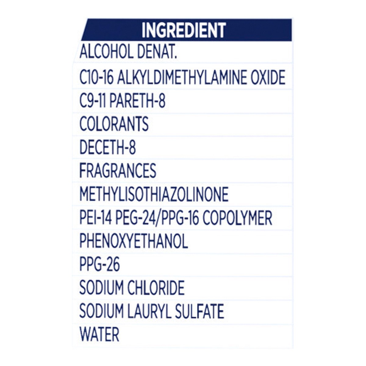 Alcohol Denat, C10-16 Alkyldimethylamine Oxide, C9-11 Pareth-8, Colorants, Deceth-8, Fragrances, Methylisothiazolinone, PEI-14 PEG-24/PPG-16 Copolymer, Phenoxyethanol, PPG-26, Sodium Chloride, Sodium …