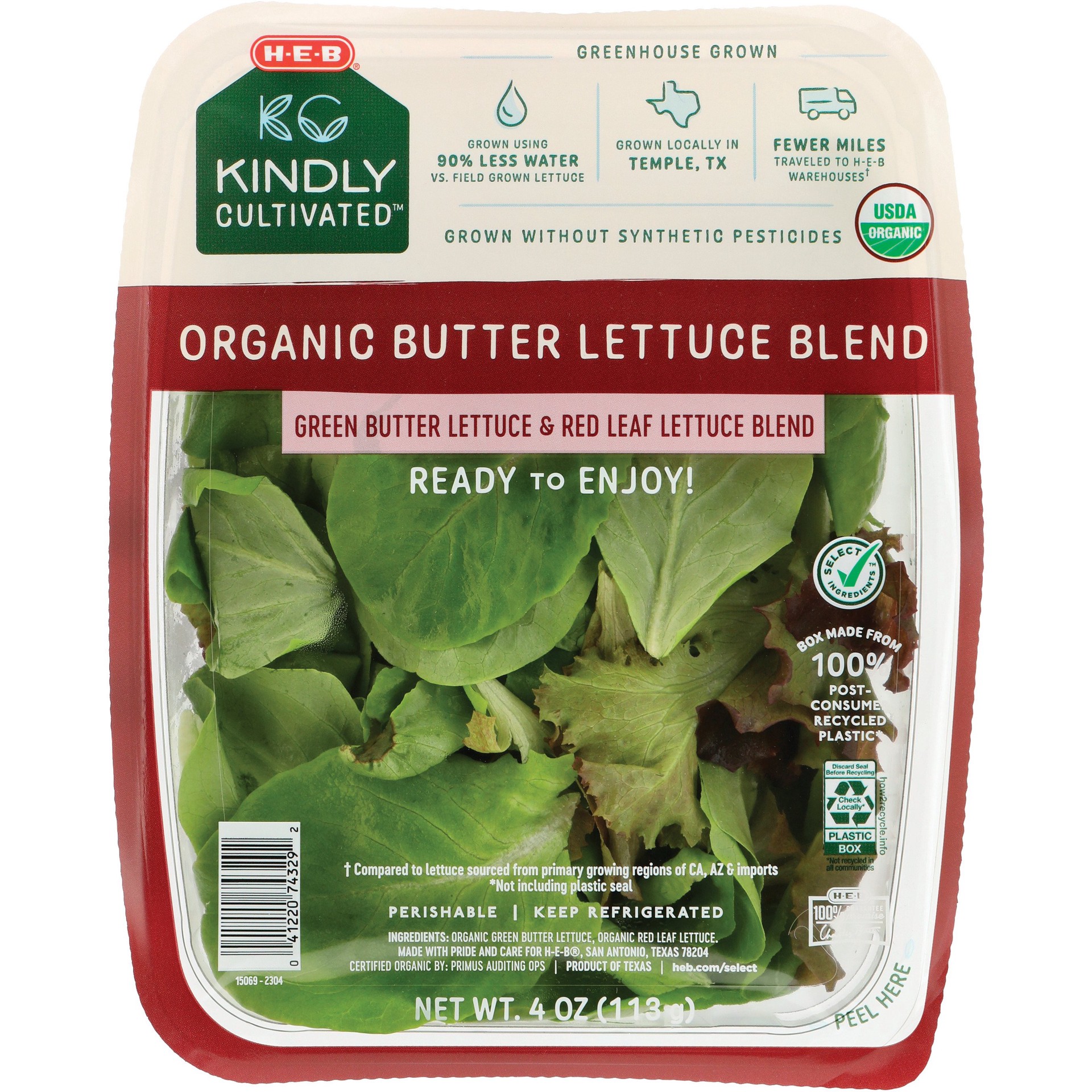 This organic blend of green butter lettuce and red leaf lettuce from H-E-B Kindly Cultivated is greenhouse-grown in Temple, Texas. Using 90% less water vs. field-grown lettuce, it flourishes without t…