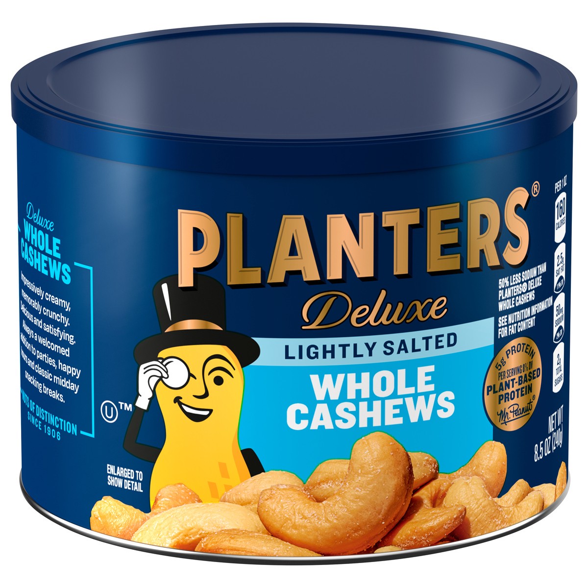 Plant-based protein. - Mr. Peanuts. Deluxe Whole Cashews: Impressive creamy, memorably crunchy. Delicious and satisfying. Always a welcomed addition to parties, happy hours and classic midday snacking…