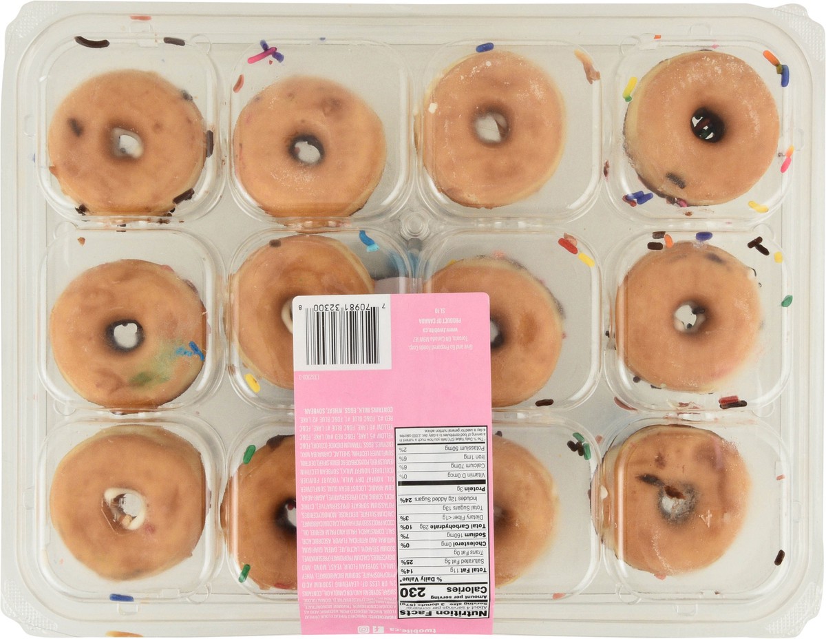 Topped with sprinkles, strawberry & maple drizzle. Naturally & artificially flavored. Made in a peanut & tree nut free facility. Peanut & tree nut free. www.twobite.ca. Facebook. Instagram. Product of…