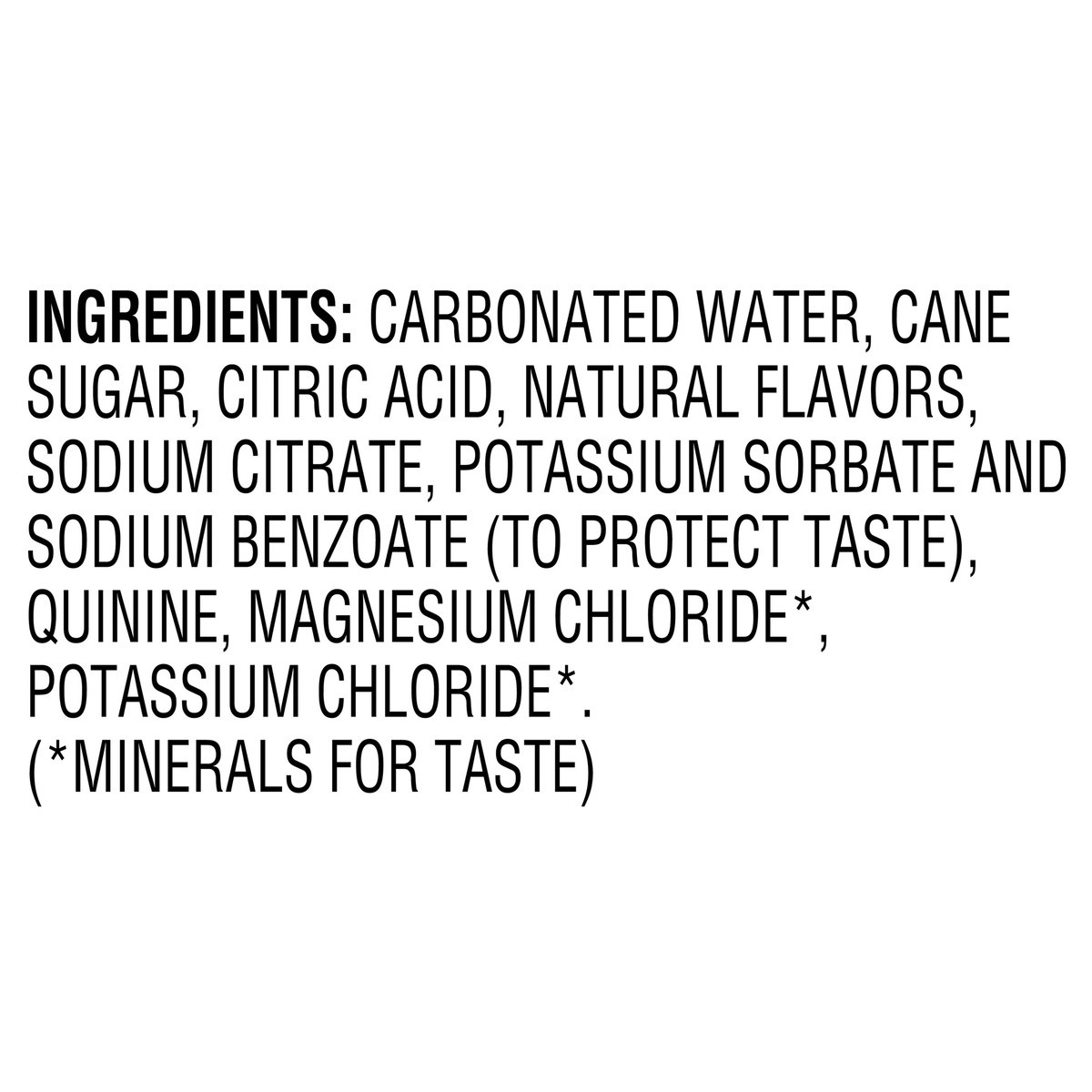 Carbonated Water, Cane Sugar, Citric Acid, Natural Flavors, Sodium Citrate, Potassium Sorbate and Sodium Benzoate (to Protect Taste), Quinine, Magnesium Chloride (Minerals for Taste), Potassium Chlori…
