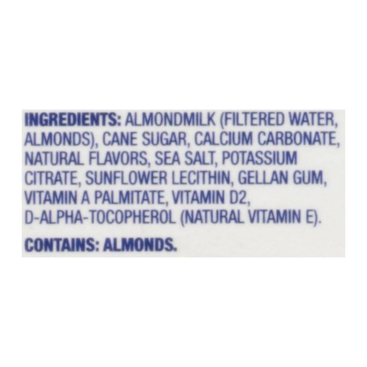 ALMONDMILK (FILTERED WATER, ALMONDS), CANE SUGAR, CALCIUM CARBONATE, NATURAL FLAVORS, SEA SALT, POTASSIUM CITRATE, SUNFLOWER LECITHIN, GELLAN GUM, VITAMIN A PALMITATE, VITAMIN D2, D-ALPHA-TOCOPHEROL (…