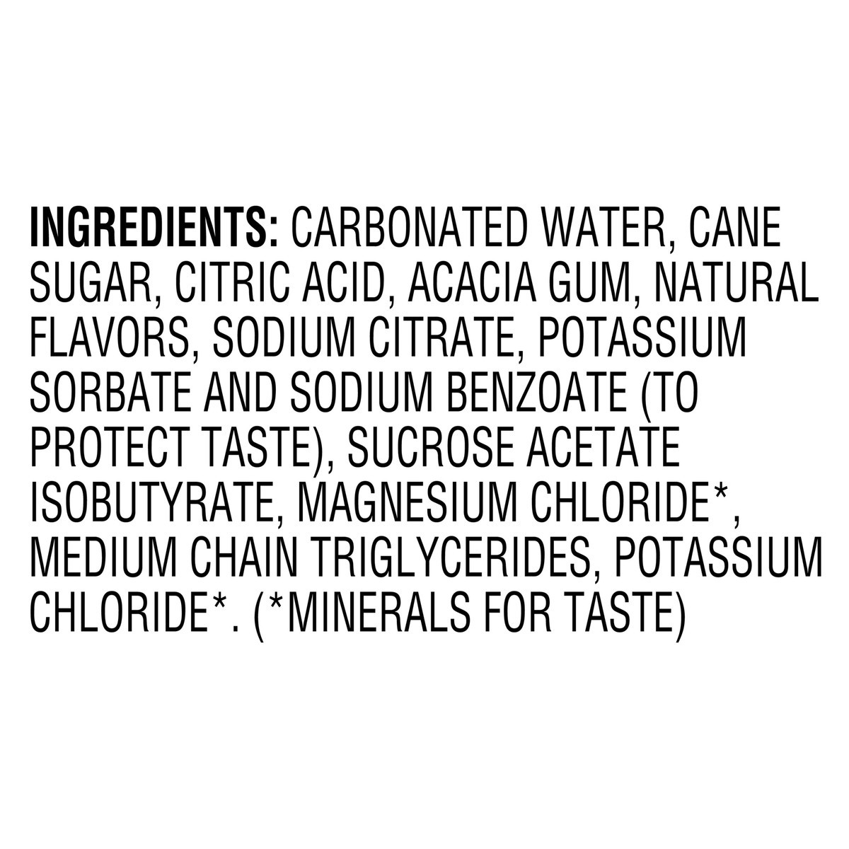 Carbonated Water, Sugar, Citric Acid, Acacia Gum, Natural Flavors, Sodium Citrate, Potassium Sorbate And Sodium Benzoate (To Protect Taste), Sucrose Acetate Isobutyrate, Magnesium Chloride, Medium Cha…
