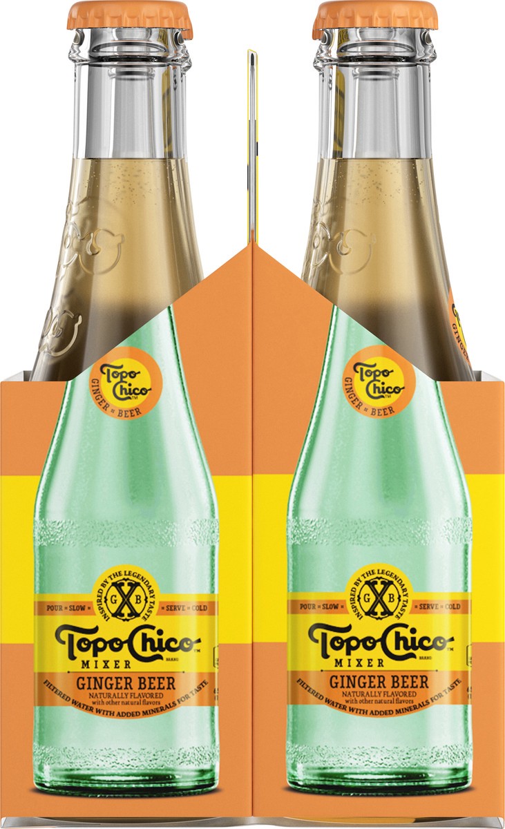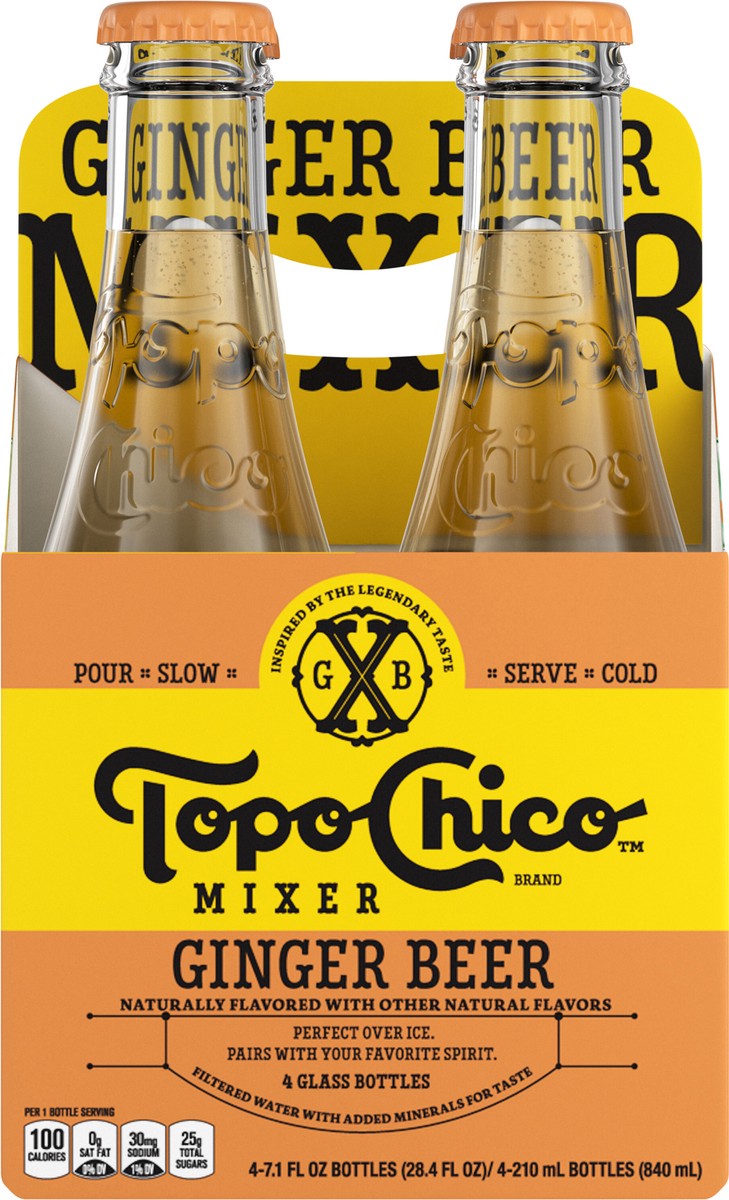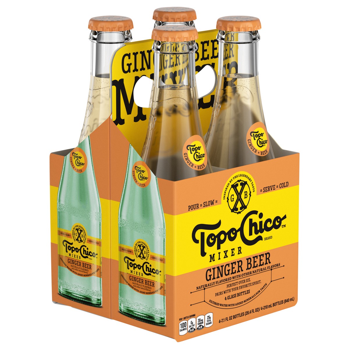- 7.1 fluid ounce glass bottles of Topo Chico Ginger Beer Mixers