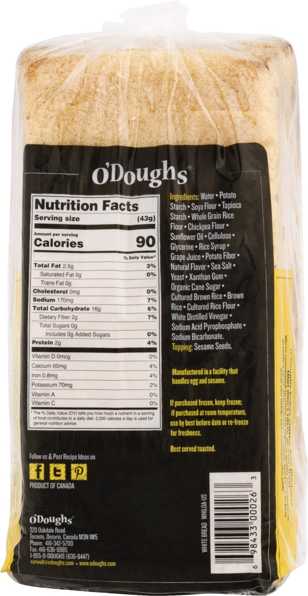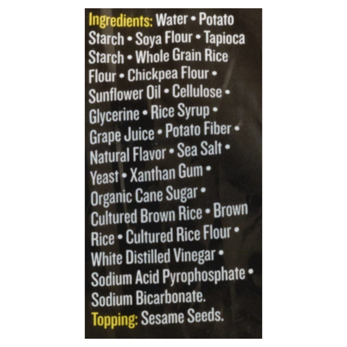 Water, Potato Starch, Soya Flour, Tapioca Starch, Whole Grain Rice Flour, Chickpea Flour, Sunflower Oil, Cellulose, Glycerine, Rice Syrup, Grape Juice, Potato Fiber, Natural Flavor, Sea Salt, Yeast, X…