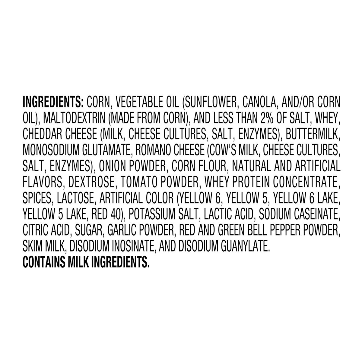 Corn, Vegetable Oil (Sunflower, Canola, and/or Corn Oil), Maltodextrin (Made from Corn), and Less than 2% of Salt, Whey, Cheddar Cheese (Milk, Cheese Cultures, Salt, Enzymes), Buttermilk, Monosodium G…