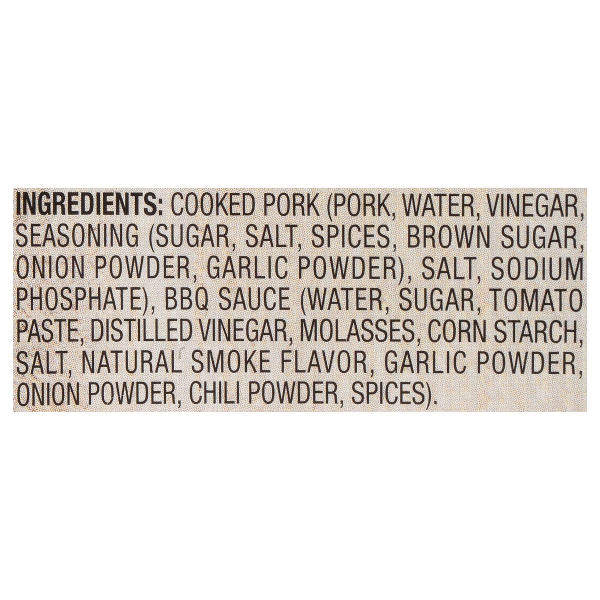 Cooked Pork (Pork, Water, Vinegar, Seasoning (Sugar, Salt, Spices, Brown Sugar, Onion Powder, Garlic Powder), Salt, Sodium Phosphate), BBQ Sauce (Water, Sugar, Tomato Paste, Distilled Vinegar, Molasse…