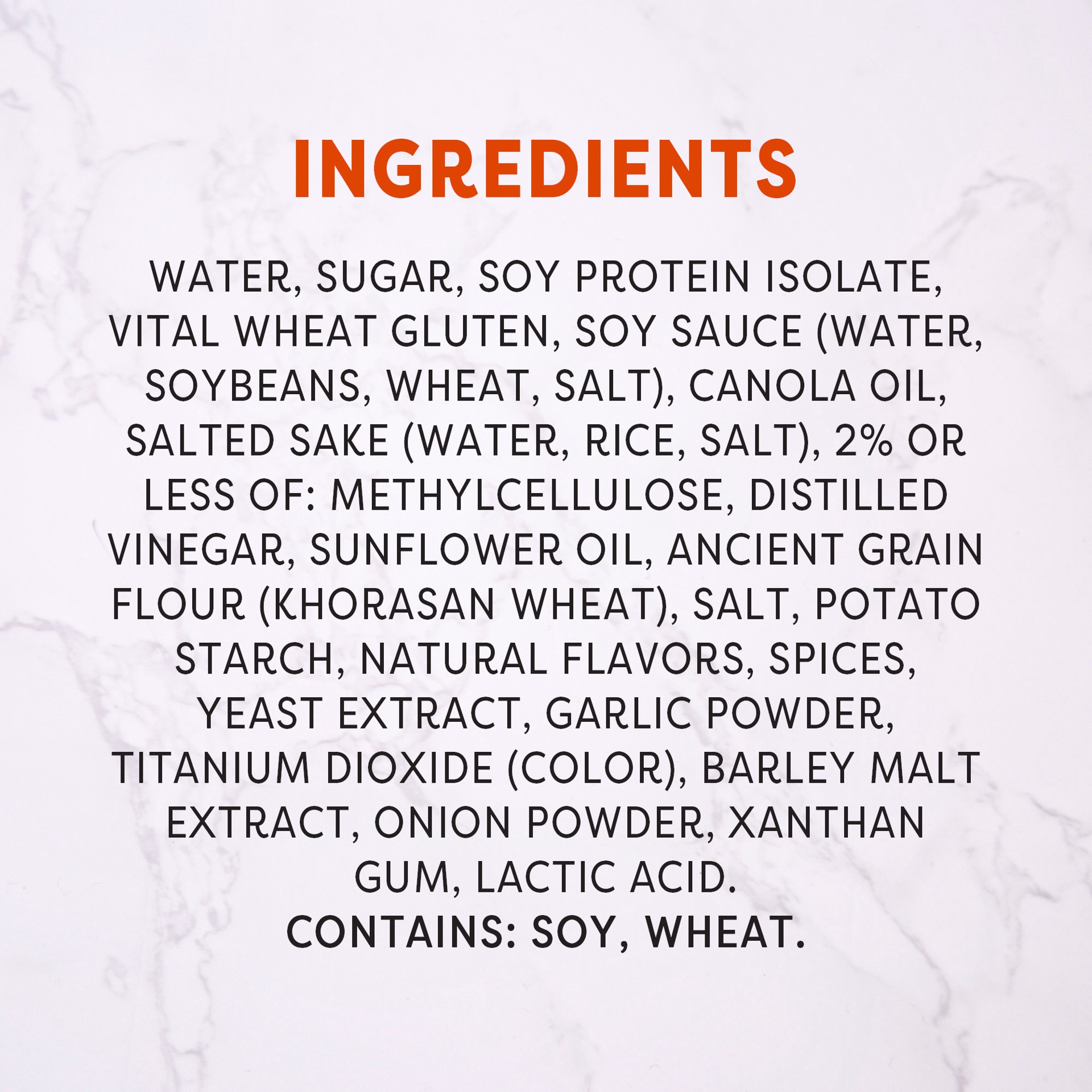 INGREDIENTS: WATER, SUGAR, SOY PROTEIN ISOLATE, VITAL WHEAT GLUTEN, SOY SAUCE (WATER, SOYBEANS, WHEAT, SALT), CANOLA OIL, SALTED SAKE (WATER, RICE, SALT), CONTAINS 2% OR LESS OF: METHYLCELLULOSE, DIST…