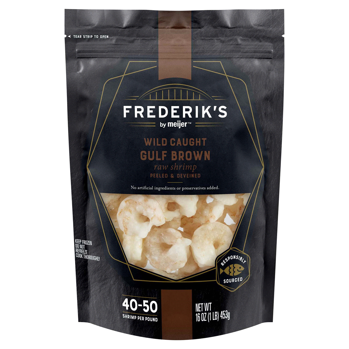 Embrace an endless amount of recipe opportunities with Frederiks by Meijer 40/50 Wild Caught Gulf Brown Raw Shrimp. Each of these conveniently peeled, deveined shrimps will enhance your favorite dishe…