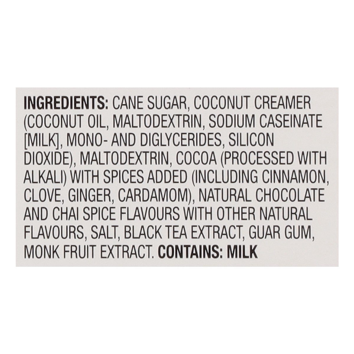 Cane Sugar, Coconut Creamer (Coconut Oil, Maltodextrin, Sodium Caseinate [Milk], Mono- and Diglycerides, Silicon Dioxide), Maltodextrin, Cocoa (Processed with Alkali) with Spices Added (Including Cinn…