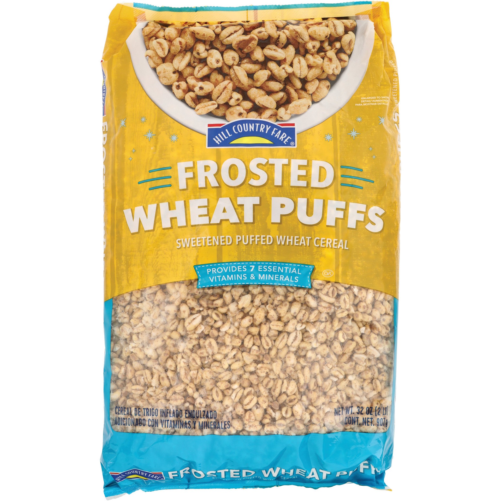 Hill Country Fare Frosted Wheat Puffs is sweetened puffed wheat cereal which provides 7 essential vitamins and minerals.