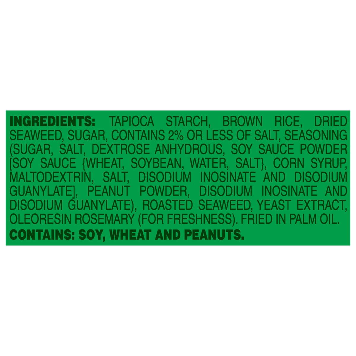 Tapioca Starch, Brown Rice, Dried Seaweed, Sugar, Contains 2% or Less of Salt, Seasoning (Sugar, Salt, Dextrose Anhydrous, Soy Sauce Powder [Soy Sauce (Wheat, Soybean, Water, Salt), Corn Syrup, Maltod…