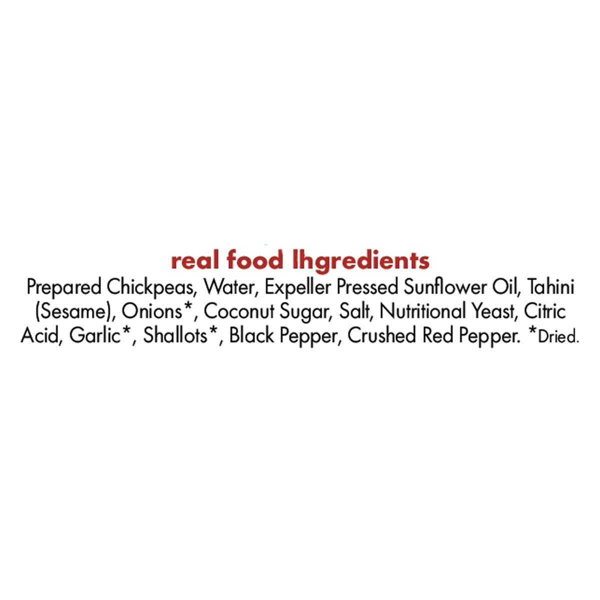 Real Food Ingredients Prepared Chickpeas, Water, Expeller Pressed Sunflower Oil, Tahini (Sesame), Onions*, Coconut Sugar, Salt, Nutritional Yeast, Citric Acid, Garlic*, Shallots*, Black Pepper, Crushe…