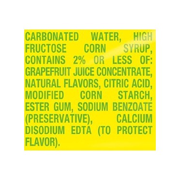 Carbonated Water, High Fructose Corn Syrup, Contains 2% or Less of: Grapefruit Juice Concentrate, Natural Flavors, Citric Acid, Modified Corn Starch, Ester Gum, Sodium Benzoate (Preservative), Calcium…