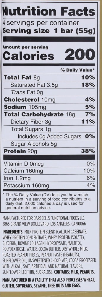 Milk protein blend (calcium caseinate, whey protein concentrate, whey protein isolate), glycerin, bovine collagen hydrolysate, maltitol, polydextrose, water, cocoa butter, dry whole milk, peanut paste…