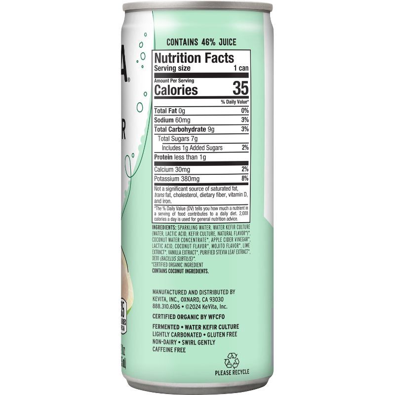 Sparkling Water, Water Kefir Culture (Water, Lactic Acid, Kefir Culture, Natural Flavor*)*, Coconut Water Concentrate*, Apple Cider Vinegar*, Lactic Acid, Coconut Flavor* Mojito Flavor*, Lime Extract*…