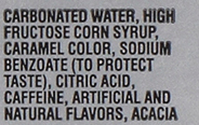Carbonated Water, High Fructose Corn Syrup, Caramel Color, Sodium Benzoate (to Protect Taste), Citric Acid, Caffeine, Artificial and Natural Flavors, Acacia.