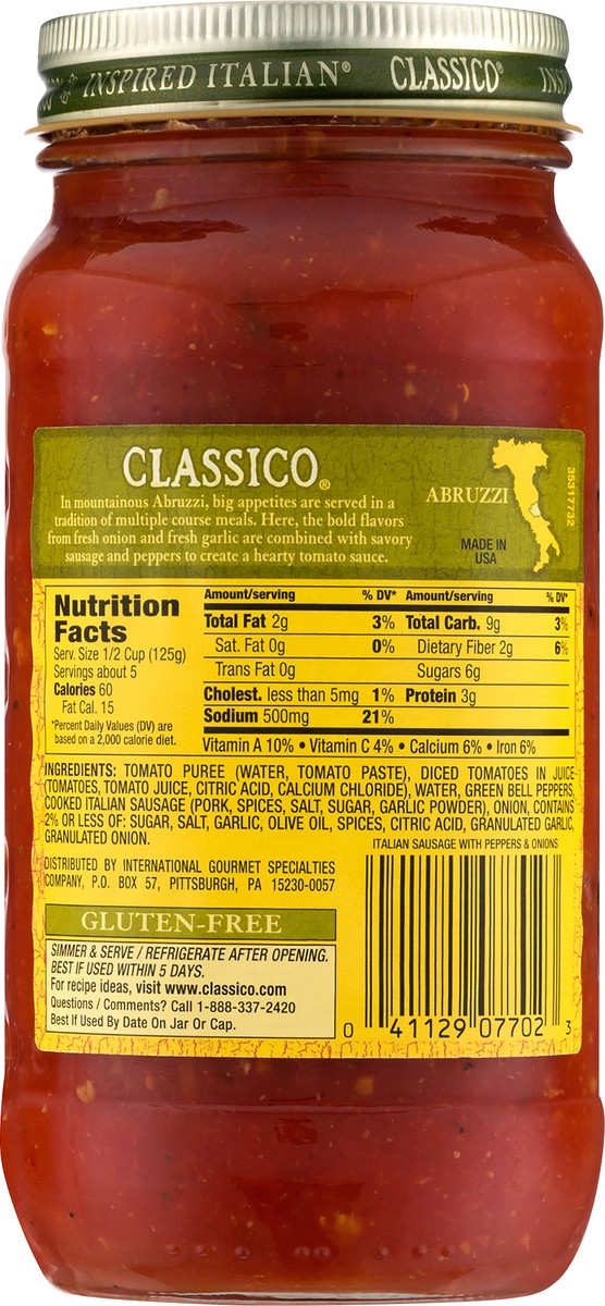 Bold flavors of onions and garlic are combined with savory sausage and peppers to create our hearty tomato sauce. Classico Italian Sausage with Peppers & Onions Pasta Sauce is easy to prepare and offe…