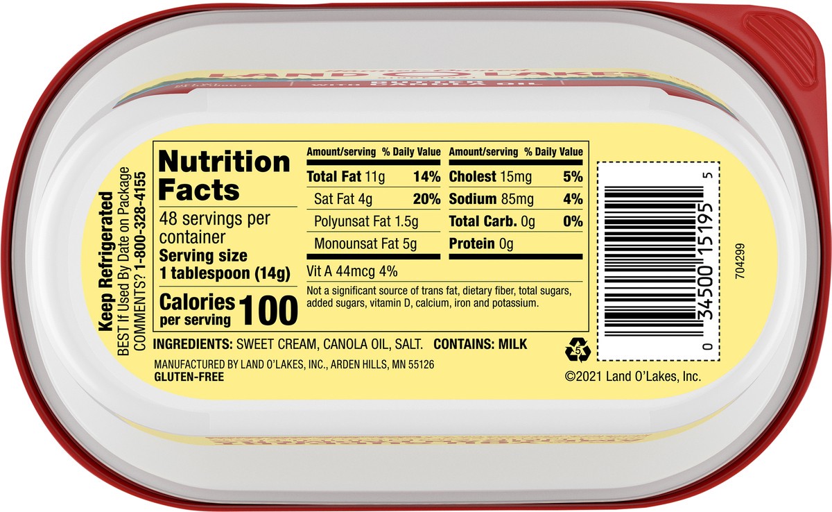 Land O Lakes Butter with Canola Oil is made with quality ingredients and gives you the taste you love, spreadable right out of the fridge. It provides the butter taste you love with the spreadable con…