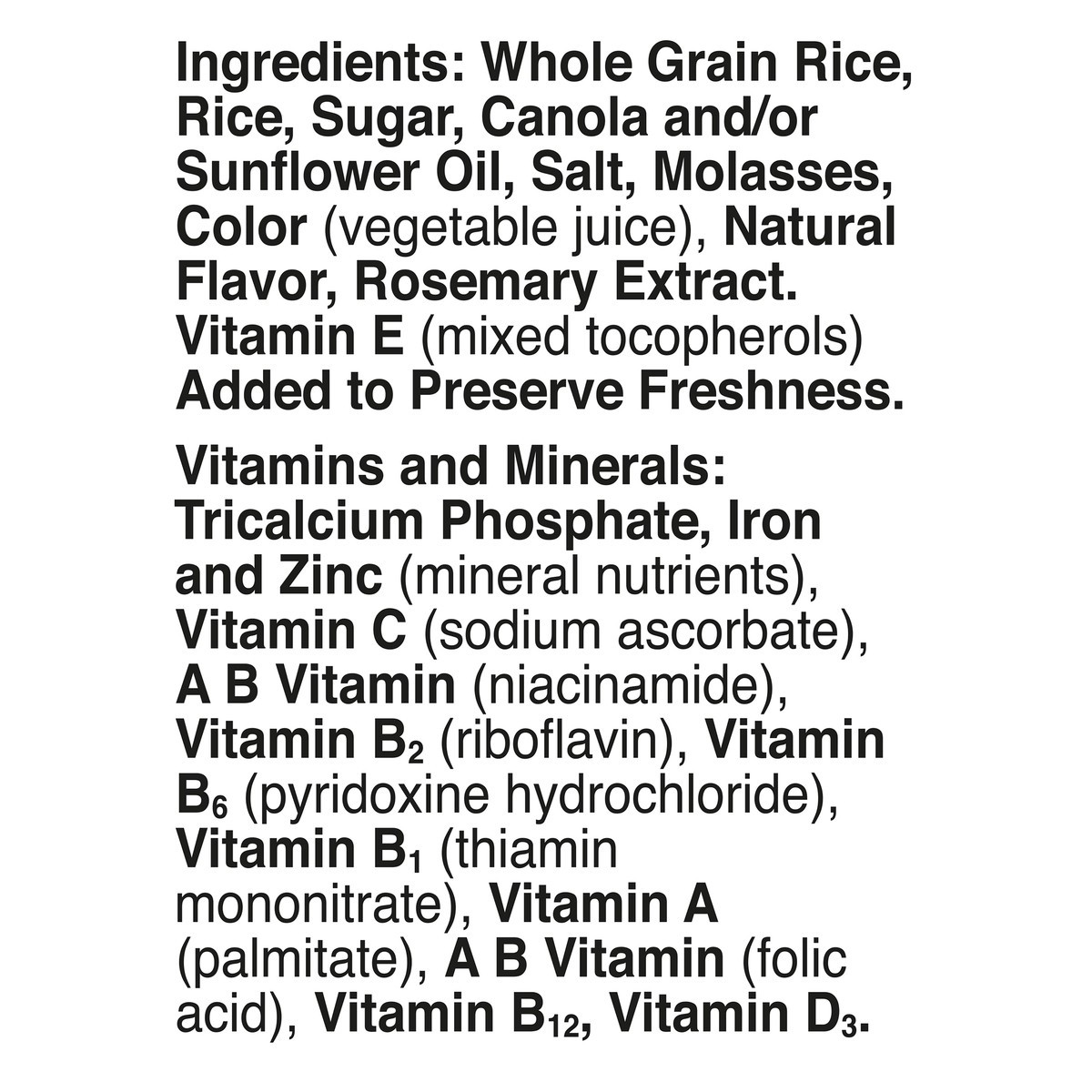 Whole Grain Rice, Rice, Sugar, Canola and/or Sunflower Oil, Salt, Molasses, Color (Vegetable Juice), Natural Flavor, Rosemary Extract, Vitamin E (Mixed Tocopherols) Added to Preserve Freshness. Vitami…