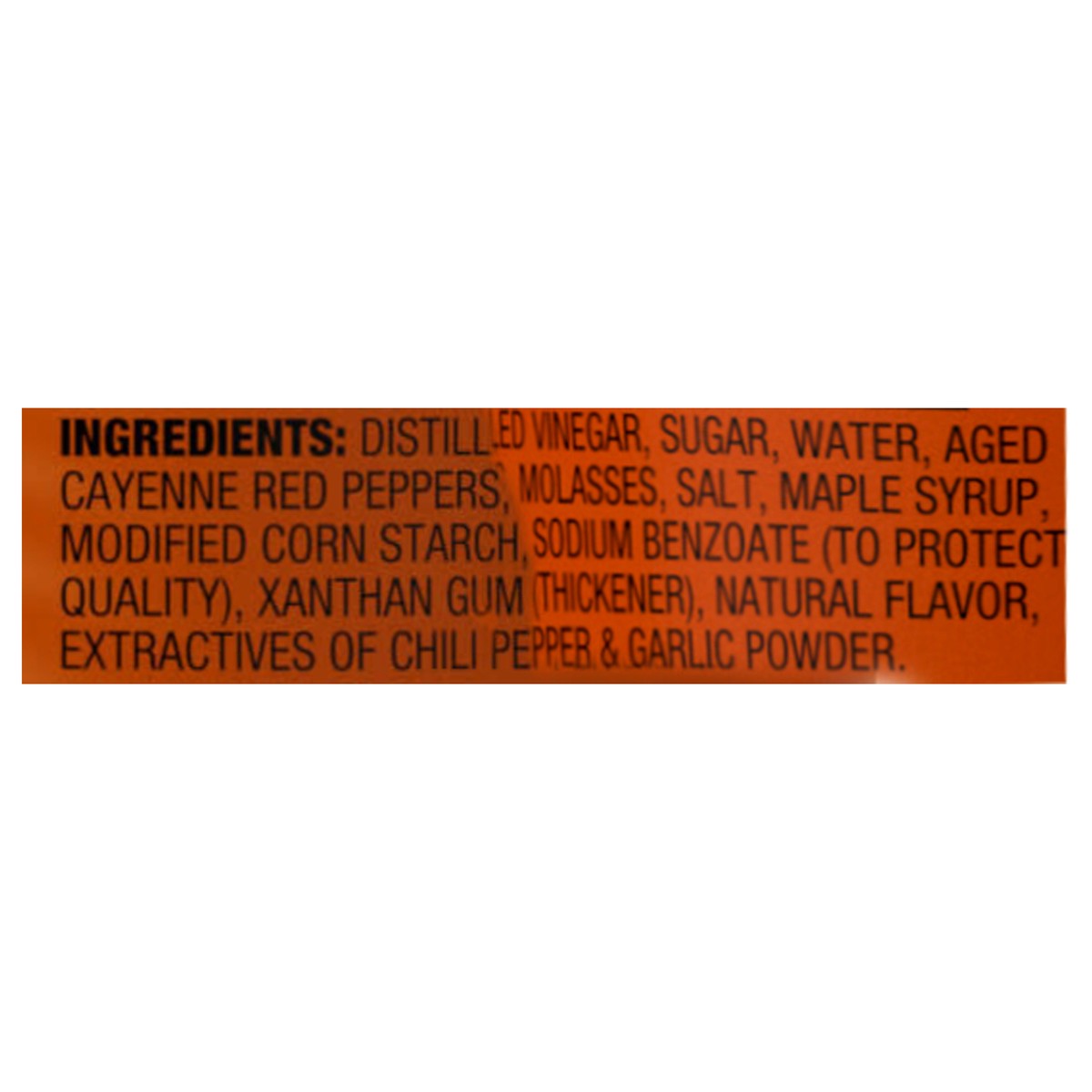Distilled Vinegar, Sugar, Water, Aged Cayenne Red Peppers, Molasses, Salt, Maple Syrup, Modified Corn Starch, Sodium Benzoate (to Protect Quality), Xanthan Gum (Thickener), Natural Flavor, Extractives…