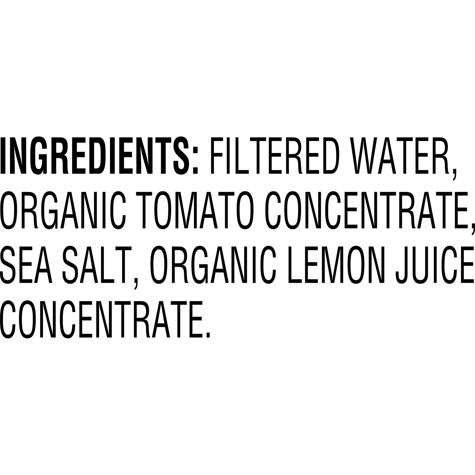 Filtered Water, Organic Tomato Concentrate, Sea Salt, Organic Lemon Juice Concentrate.