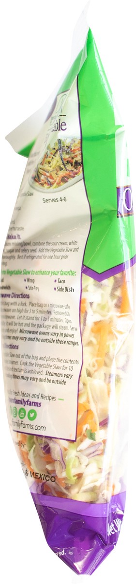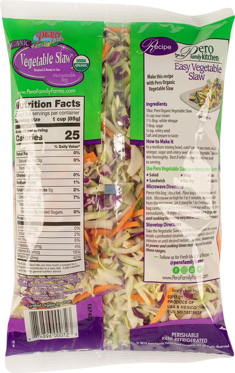 Green cabbage. red cabbage, broccoli & carrots. USDA Organic. Certified Organic by CCOF. New! Healthy side dish! Make it in 5 minutes or less. Washed & ready to use. Microwavable bag. Sustainable farm…