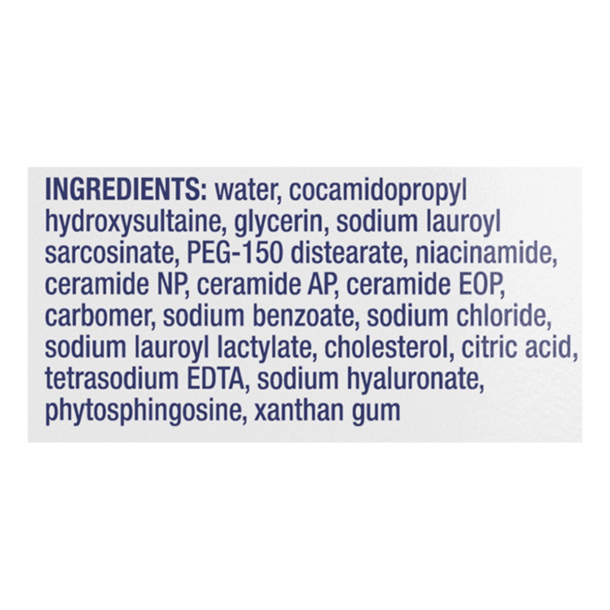 Water, Cocamidopropyl Hydroxysultaine, Glycerin, Sodium Lauroyl Sarcosinate, PEG-150 Distearate, Niacinamide, Ceramide NP, Ceramide AP, Ceramide EOP, Carbomer, Sodium Benzoate, Sodium Chloride, Sodium…