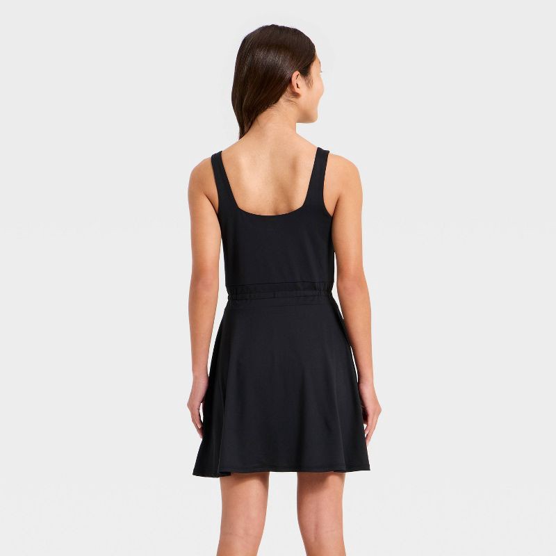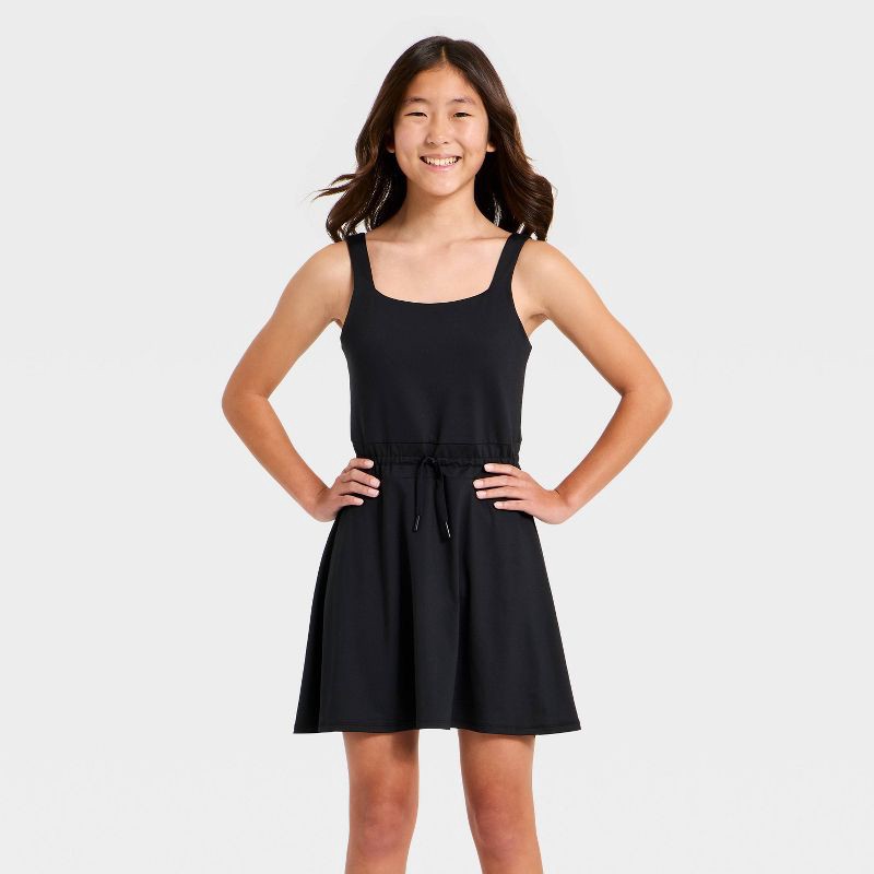 Why we're ALL IN:Knit active dress with a sleeveless design, scoop neckline and comfy shoulder straps. Crafted from midweight recycled polyester-spandex blend jersey fabric to keep your child moving c…