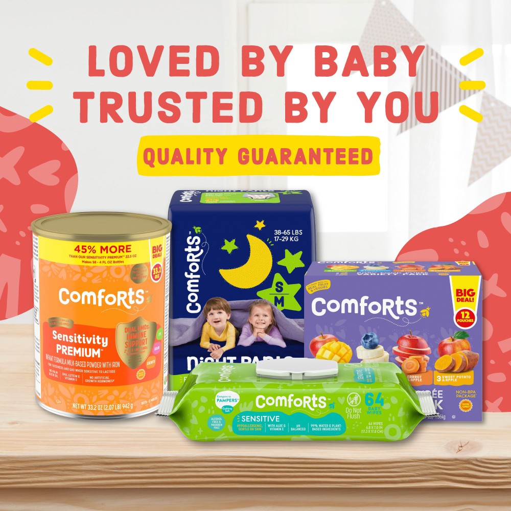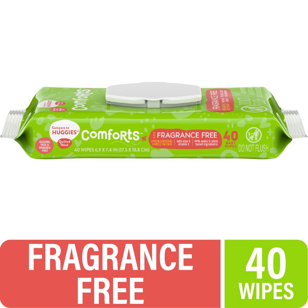 Comforts™ Fragrance Free Baby Wipes offer gentle cleansing for baby. These hypoallergenic wipes are made from quilted-thick, 99% water and plant-based ingredients for easy cleaning and care. Contains …