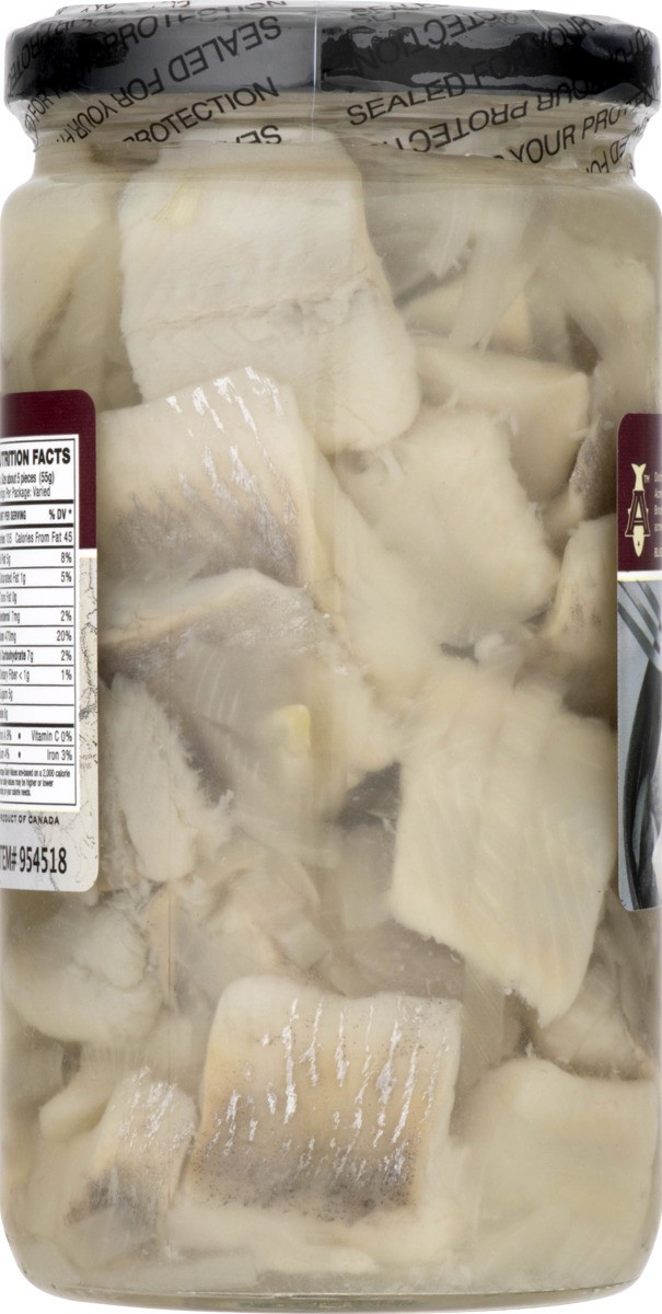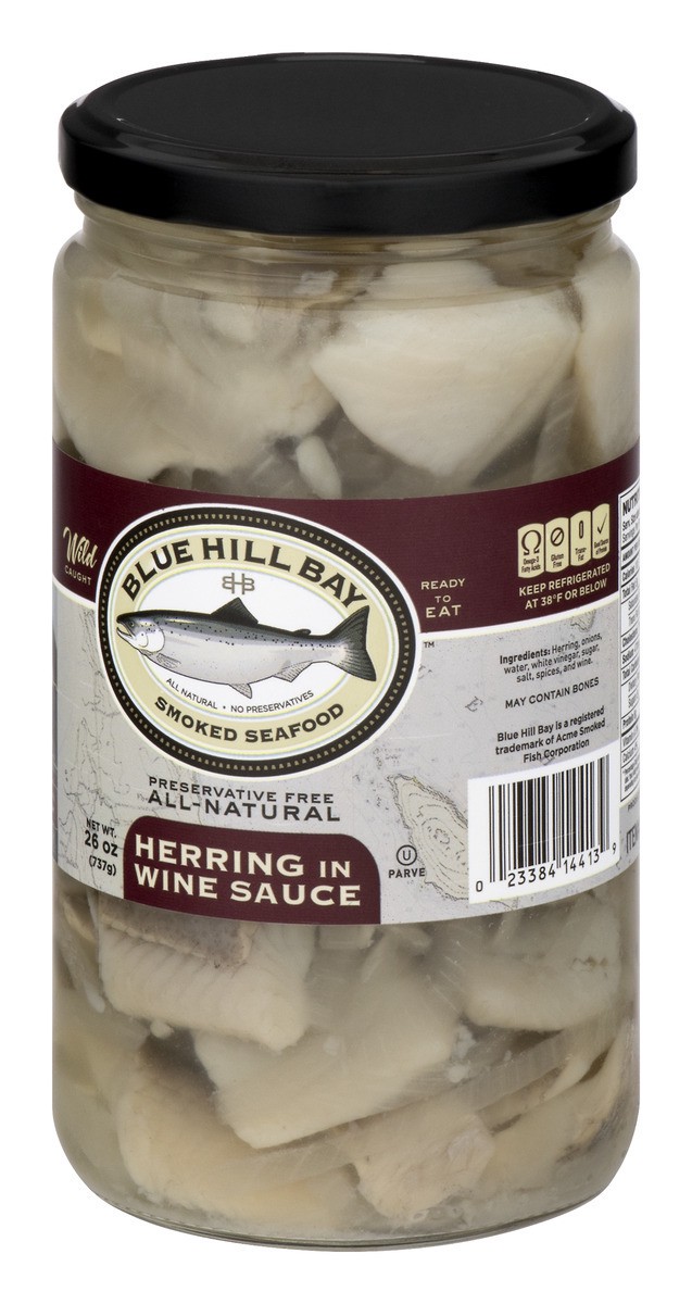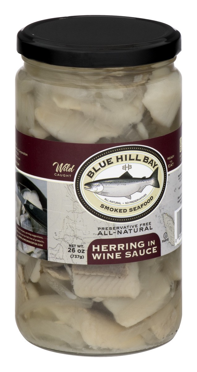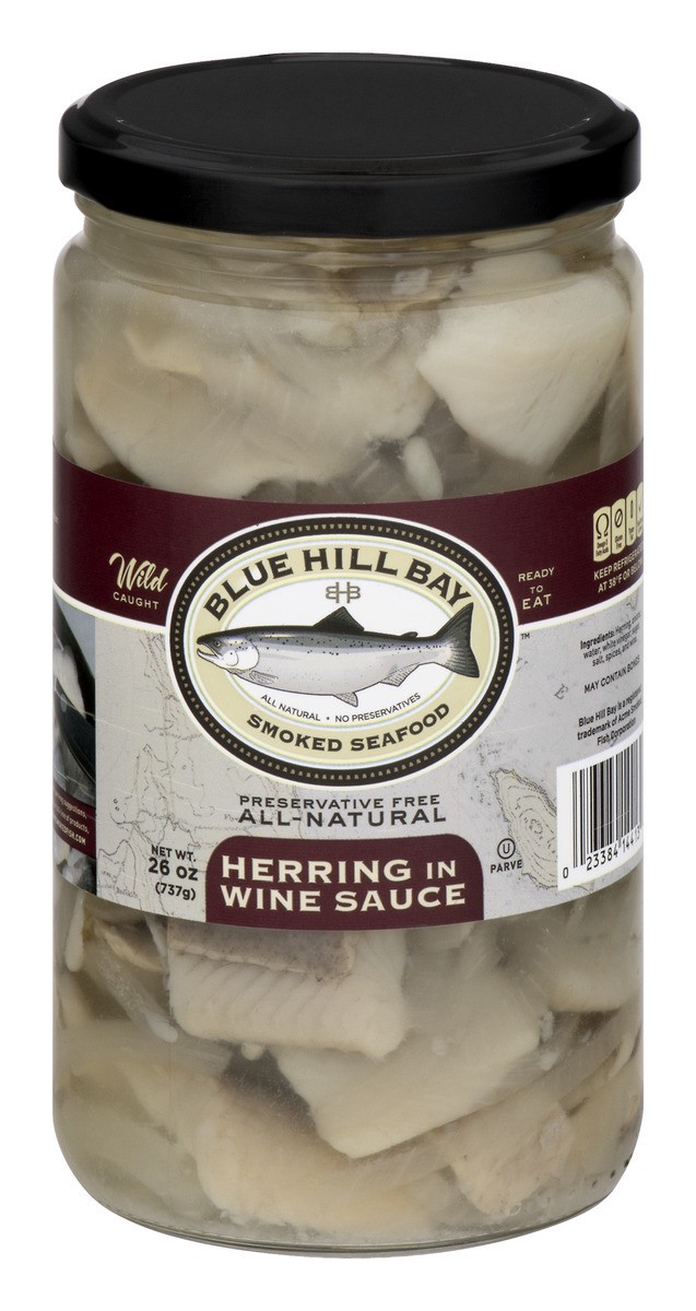 Herring, Onions, Water, White Vinegar, Sugar, Salt, Spices, and Wine.