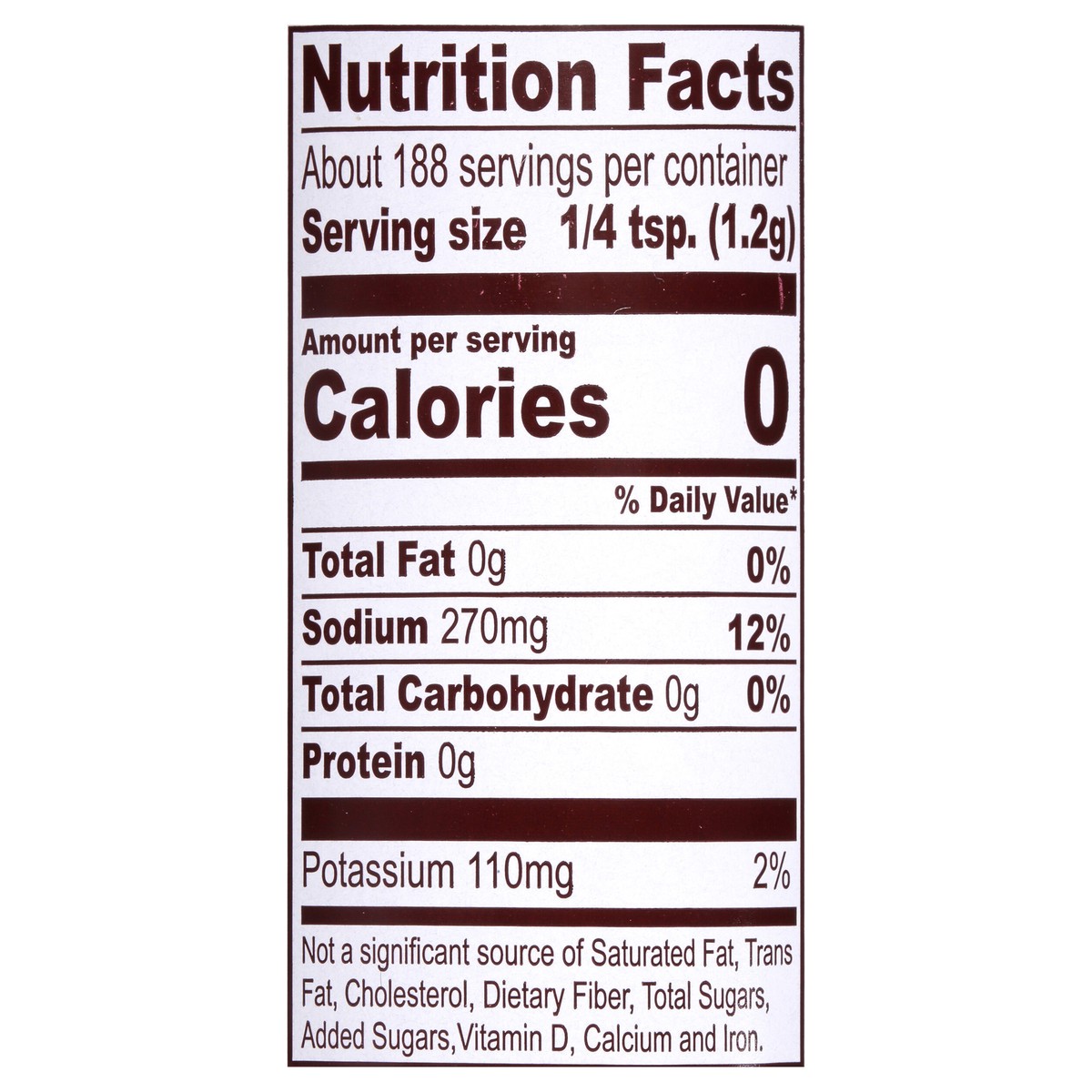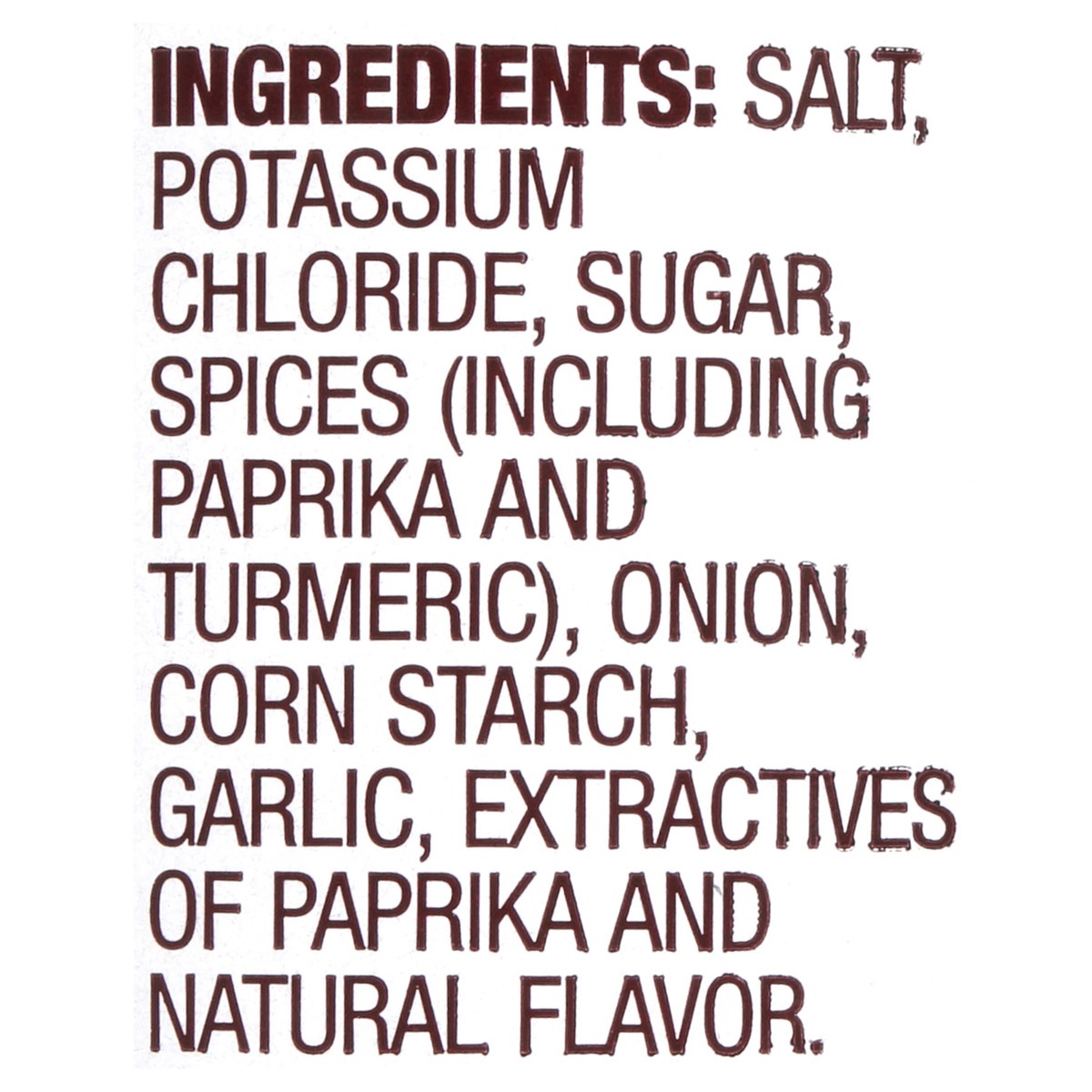 Salt, Potassium Chloride, Sugar, Spices (Including Paprika, Celery Seed, Turmeric), Onion, Corn Starch, Garlic, Extractives of Paprika and Natural Flavor.