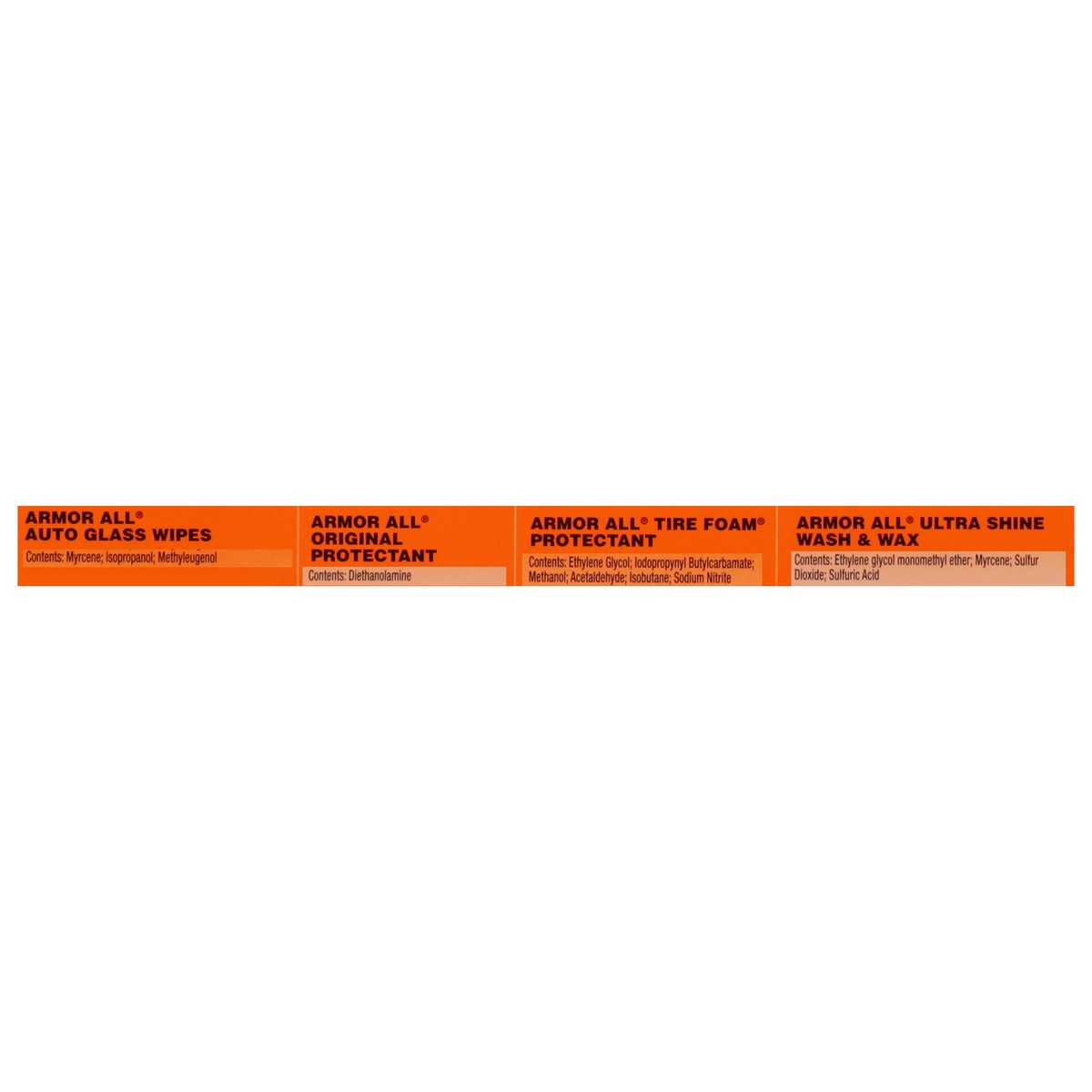 Armor All® Auto Glass Wipes: Myrcene, Isopropanol, Methyleugenol, Armor All® Original Protectant: Diethanolamine, Armor All® Tire Foam® Protectant: Ethylene Glycol, Iodopropynyl Butylcarbamate, Methan…