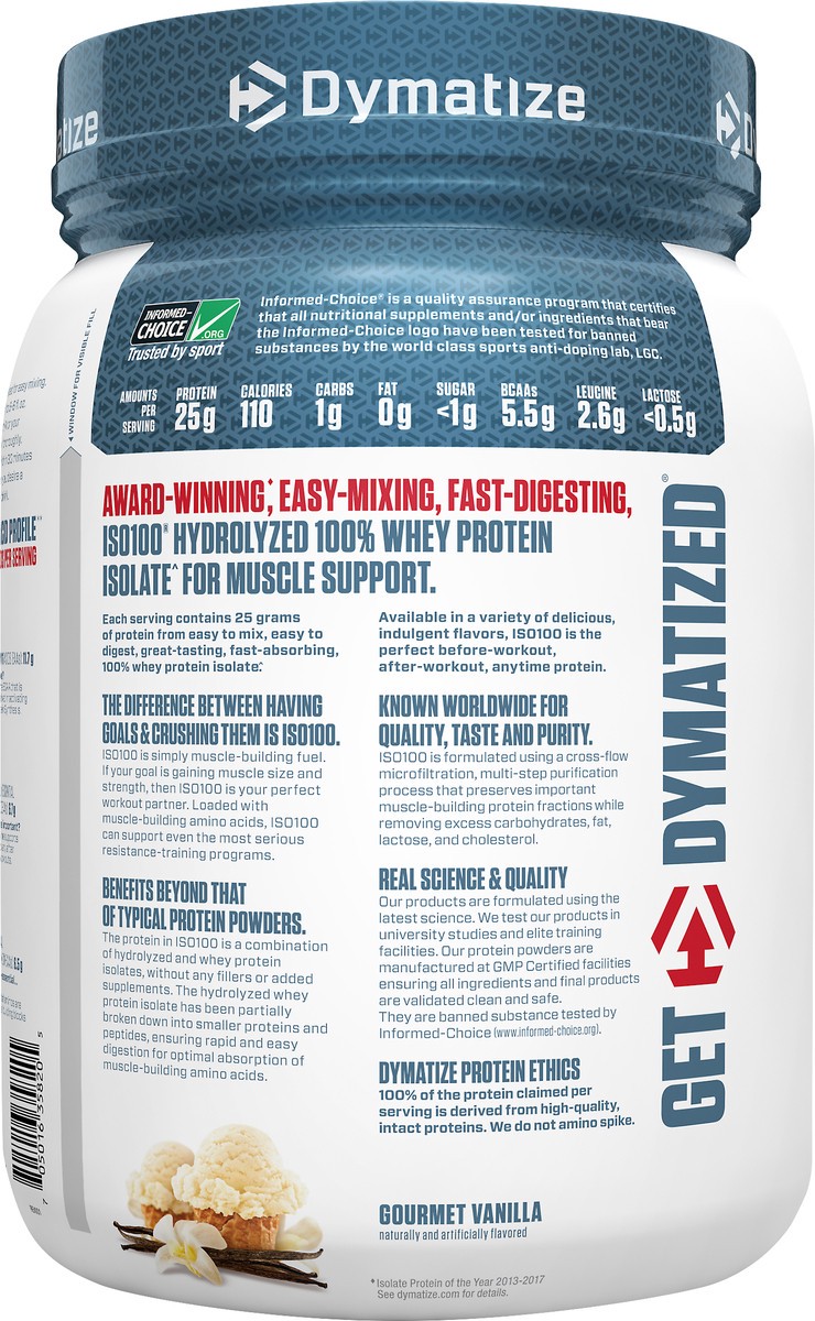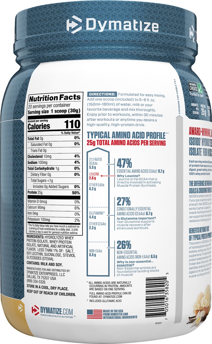 Naturally and artificially flavored. 25 g protein. 5.5 g BCAAs. 2.6 g leucine. Amounts Per Serving: 25 g protein; 110 calories; 1 g carbs; 0 g fat; less than 1 g sugar; 5.5 g BCAAs; 2.6 g leucine; les…