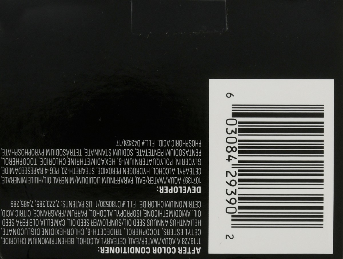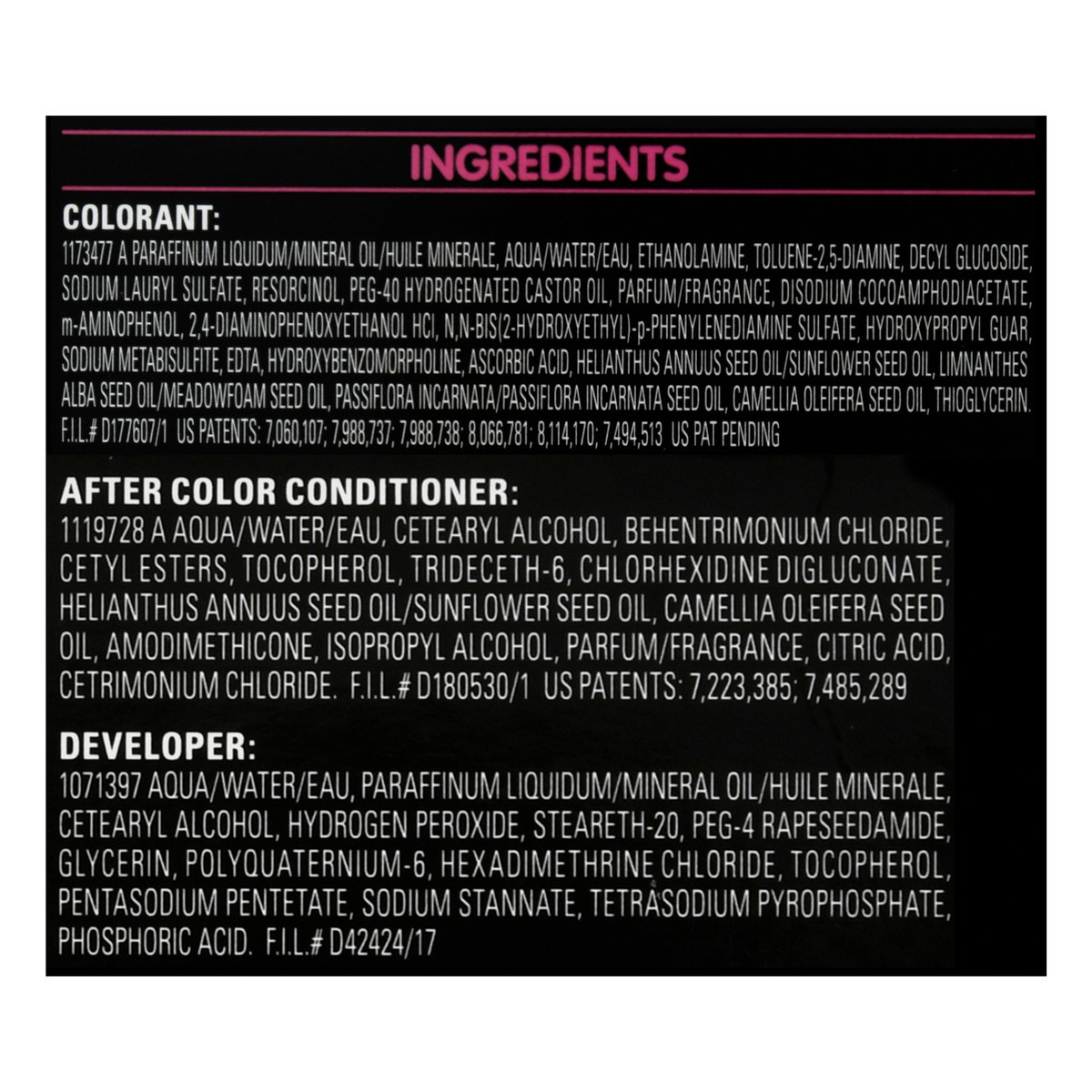 Colorant: Paraffinum Liquidum/Mineral Oil/Huile Minerale, Aqua/Water/Eau, Ethanolamine, Toluene-2.5-Diamine, Decyl Glucoside, Sodium Lauryl Sulfate, Resorcinol, PEG-40 Hydrogenated Castor Oil, Parfum/…