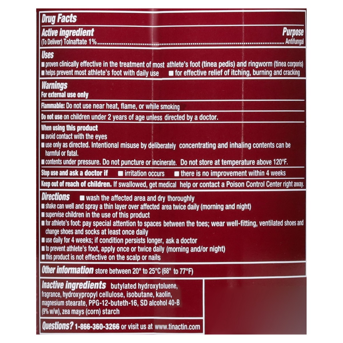 Active Ingredients: (To Deliver) Tolnaftate 1% (1 %), Antifungal. Inactive Ingredients: Butylated Hydroxytoluene, Fragrance, Hydroxypropyl Cellulose, Isobutane, Kaolin, Magnesium Stearate, PPG-12-Bute…