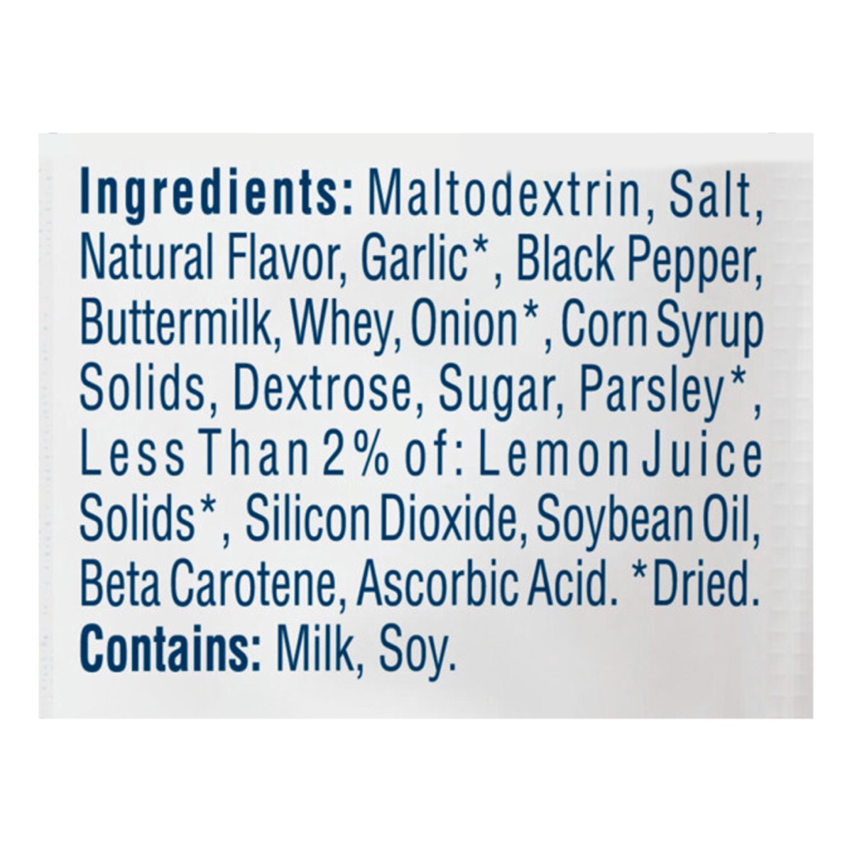 Maltodextrin, Salt, Natural Flavor, Garlic*, Black Pepper, Buttermilk, Whey, Onion*, Corn Syrup Solids, Dextrose, Sugar, Parsley*, Less than 2% of: Lemon Juice Solids*, Silicon Dioxide, Soybean Oil, B…